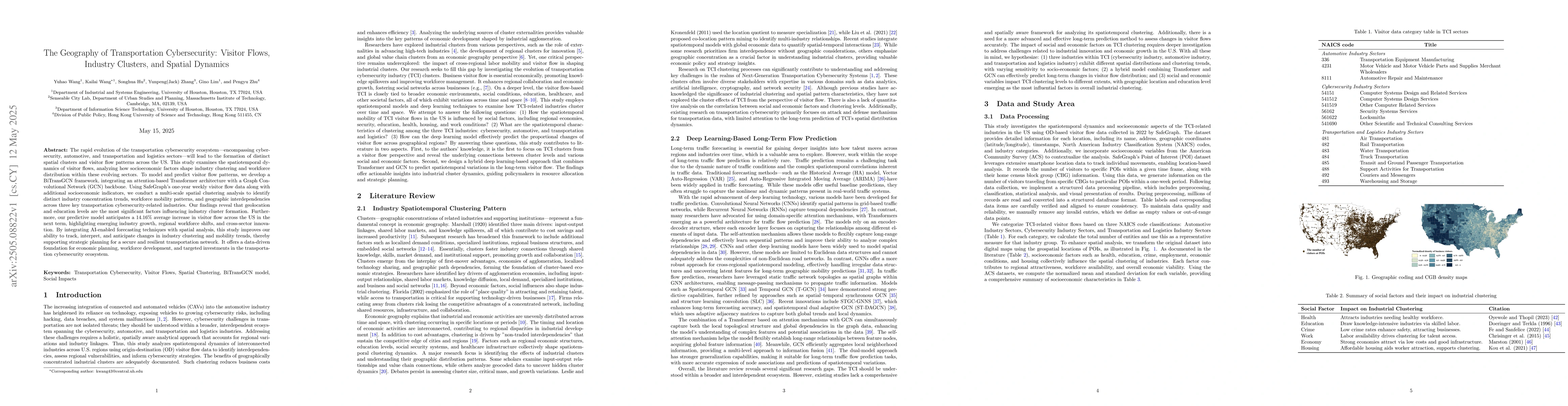 The rapid evolution of the transportation cybersecurity ecosystem, encompassing cybersecurity, automotive, and transportation and logistics sectors, will lead to the formation of distinct spatial clusters and visitor flow patterns across the US. This study examines the spatiotemporal dynamics of visitor flows, analyzing how socioeconomic factors shape industry clustering and workforce distribution within these evolving sectors. To model and predict visitor flow patterns, we develop a BiTransGCN framework, integrating an attention-based Transformer architecture with a Graph Convolutional Network backbone. By integrating AI-enabled forecasting techniques with spatial analysis, this study improves our ability to track, interpret, and anticipate changes in industry clustering and mobility trends, thereby supporting strategic planning for a secure and resilient transportation network. It offers a data-driven foundation for economic planning, workforce development, and targeted investments in the transportation cybersecurity ecosystem.