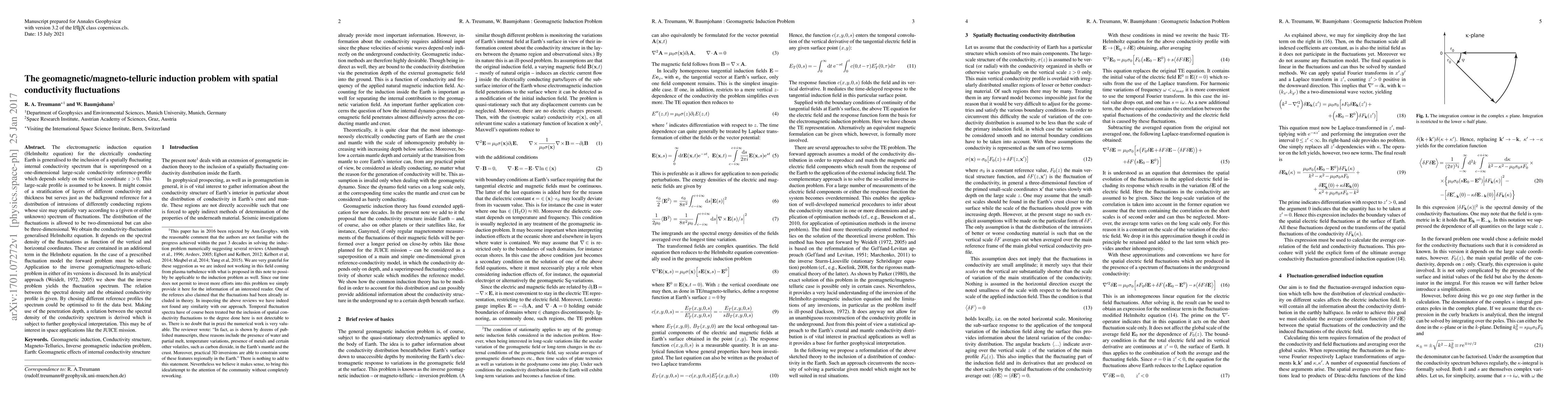 The electromagnetic induction equation (Helmholtz equation) for the electrically conducting Earth is generalised to the inclusion of a spatially fluctuating internal conductivity spectrum that is superimposed on a one-dimensional large-scale conductivity reference-profile which depends solely on the vertical coordinate z>0. This large-scale profile is assumed to be known. The distribution of the fluctuations is allowed to be arbitrary. The conductivity-fluctuation generalised Helmholtz equation depends on the spectral density of the fluctuations as function of the vertical and horizontal coordinates. Application to the inverse geomagnetic/magneto-telluric problem is discussed. We show analytically that the inverse problem yields the conductivity fluctuation spectrum. The relation between the spectral density and the obtained conductivity profile is given.