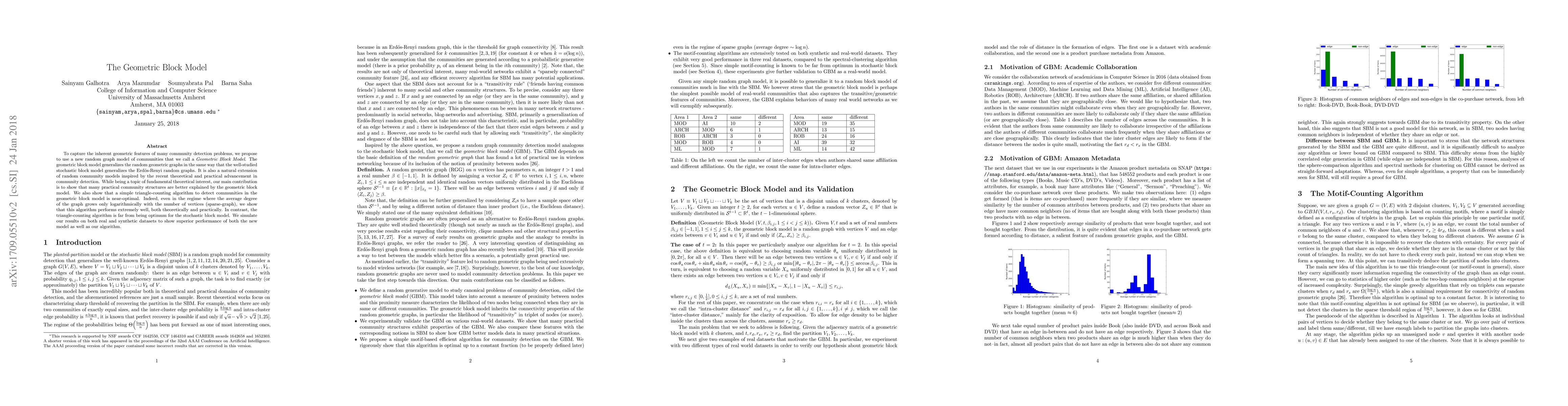 To capture the inherent geometric features of many community detection problems, we propose to use a new random graph model of communities that we call a Geometric Block Model. The geometric block model generalizes the random geometric graphs in the same way that the well-studied stochastic block model generalizes the Erdos-Renyi random graphs. It is also a natural extension of random community models inspired by the recent theoretical and practical advancement in community detection. While being a topic of fundamental theoretical interest, our main contribution is to show that many practical community structures are better explained by the geometric block model. We also show that a simple triangle-counting algorithm to detect communities in the geometric block model is near-optimal. Indeed, even in the regime where the average degree of the graph grows only logarithmically with the number of vertices (sparse-graph), we show that this algorithm performs extremely well, both theoretically and practically. In contrast, the triangle-counting algorithm is far from being optimum for the stochastic block model. We simulate our results on both real and synthetic datasets to show superior performance of both the new model as well as our algorithm.
