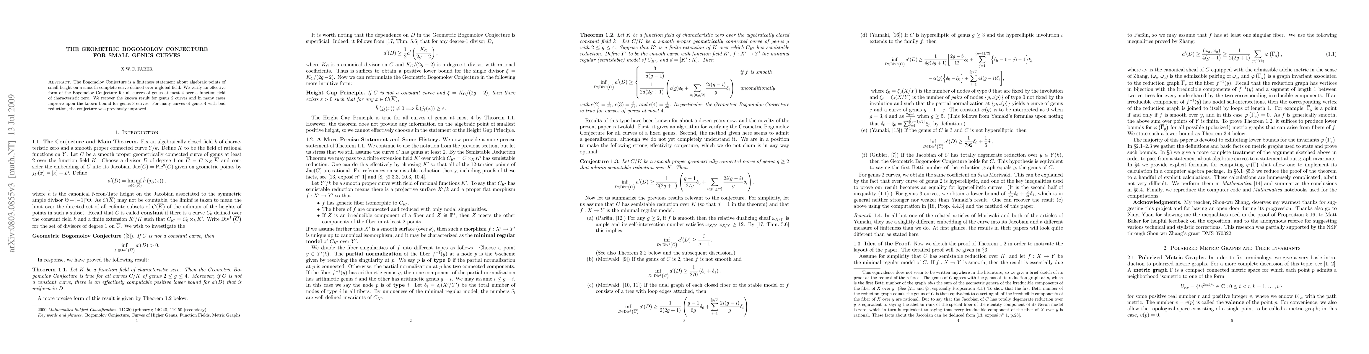 The Geometric Bogomolov Conjecture for small genus curves confirms an effective form of the conjecture for curves of genus at most 4 over function fields, improving known bounds and proving previously unestablished cases for genus 4 curves with bad reduction.