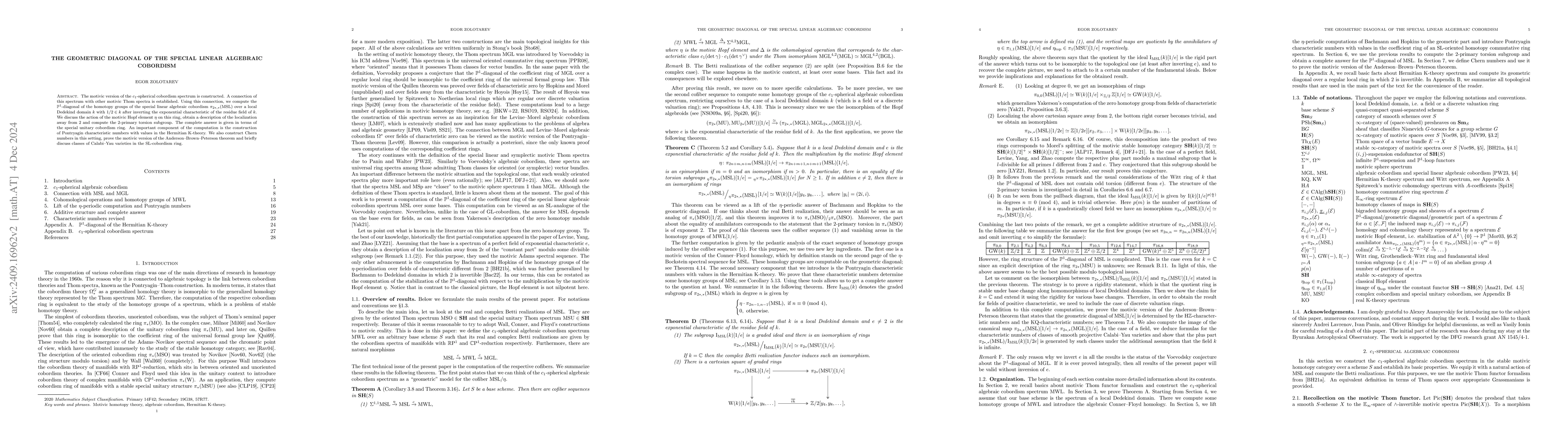 The motivic version of the $c_1$-spherical cobordism spectrum is constructed. A connection of this spectrum with other motivic Thom spectra is established. Using this connection, we compute the $\mathbb{P}^1$-diagonal of the homotopy groups of the special linear algebraic cobordism $\pi_{2*,*}(\mathrm{MSL})$ over a local Dedekind domain $k$ with $1/2\in k$ after inverting the exponential characteristic of the residue field of $k$. We discuss the action of the motivic Hopf element $\eta$ on this ring, obtain a description of the localization away from $2$ and compute the $2$-primary torsion subgroup. The complete answer is given in terms of the special unitary cobordism ring. An important component of the computation is the construction of Pontryagin characteristic numbers with values in the Hermitian K-theory. We also construct Chern numbers in this setting, prove the motivic version of the Anderson--Brown--Peterson theorem and briefly discuss classes of Calabi--Yau varieties in the $\mathrm{SL}$-cobordism ring.