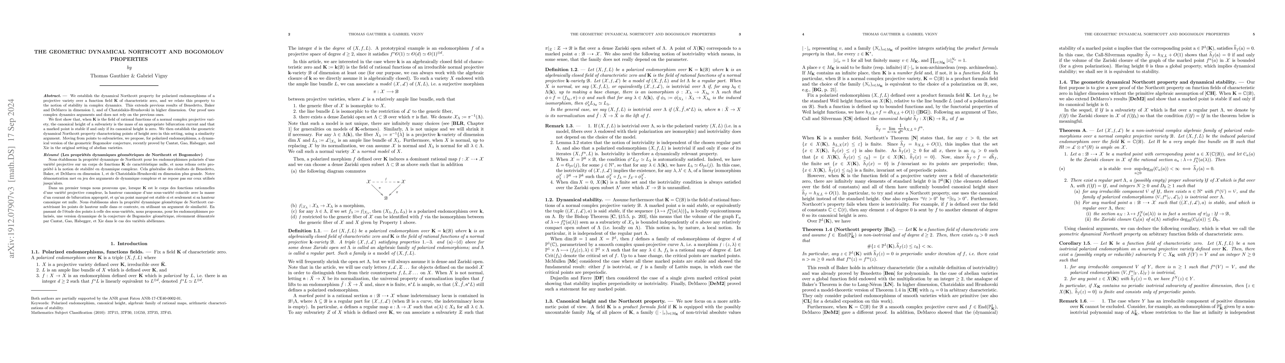 We establish the Geometric Dynamical Northcott Property for polarized endomorphisms of a projective normal variety over a function field $\mathbf{K}$ of characteristic zero. This extends previous results of Benedetto, Baker and DeMarco in dimension $1$, and of Chatzidakis-Hrushovski in higher dimension. Our proof uses complex dynamics arguments and does not rely on the previous one. We first show that when $\mathbf{K}$ is the field of rational functions of a smooth complex projective variety, the canonical height of a subvariety is the mass of the appropriate bifurcation current and that a marked point is stable if and only if its canonical height is zero. We then establish the Geometric Dynamical Northcott Property using a similarity argument. Moving from points to subvarieties, we propose, for polarized endomorphisms, a dynamical version of the Geometric Bogomolov Conjecture, recently proved by Cantat, Gao, Habegger and Xie. We establish several cases of this conjecture notably non-isotrivial polynomial skew-product with an isotrivial first coordinate.