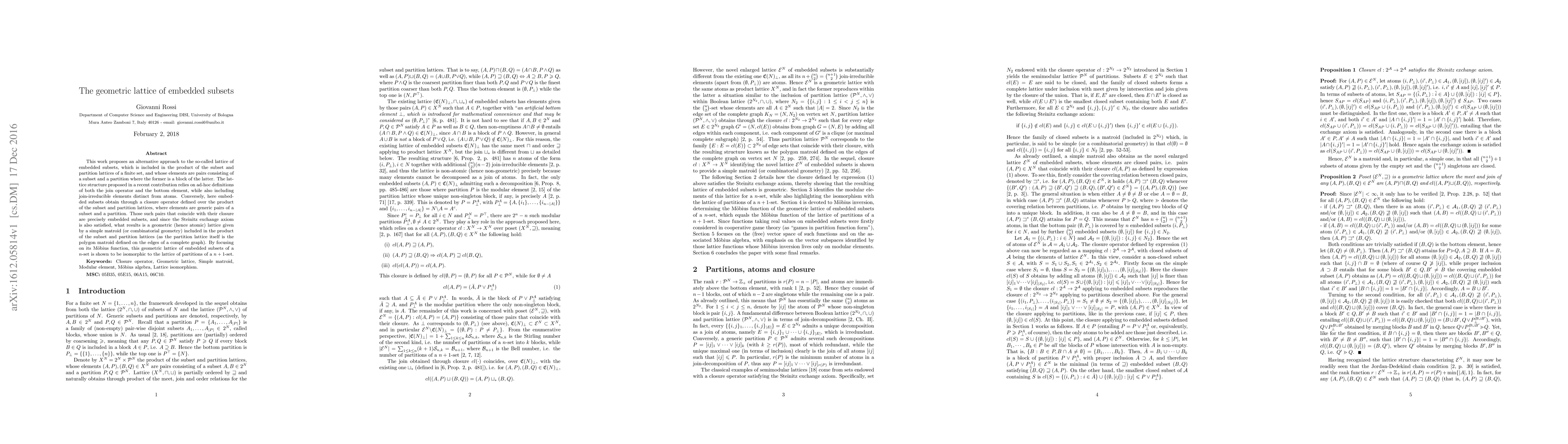 This work proposes an alternative approach to the so-called lattice of embedded subsets, which is included in the product of the subset and partition lattices of a finite set, and whose elements are pairs consisting of a subset and a partition where the former is a block of the latter. The lattice structure proposed in a recent contribution relies on ad-hoc definitions of both the join operator and the bottom element, while also including join-irreducible elements distinct from atoms. Conversely, here embedded subsets obtain through a closure operator defined over the product of the subset and partition lattices, where elements are generic pairs of a subset and a partition. Those such pairs that coincide with their closure are precisely embedded subsets, and since the Steinitz exchange axiom is also satisfied, what results is a geometric (hence atomic) lattice given by a simple matroid (or combinatorial geometry) included in the product of the subset and partition lattices (as the partition lattice itself is the polygon matroid defined on the edges of a complete graph). By focusing on its M\"obius function, this geometric lattice of embedded subsets of a n-set is shown to be isomorphic to the lattice of partitions of a n+1-set.