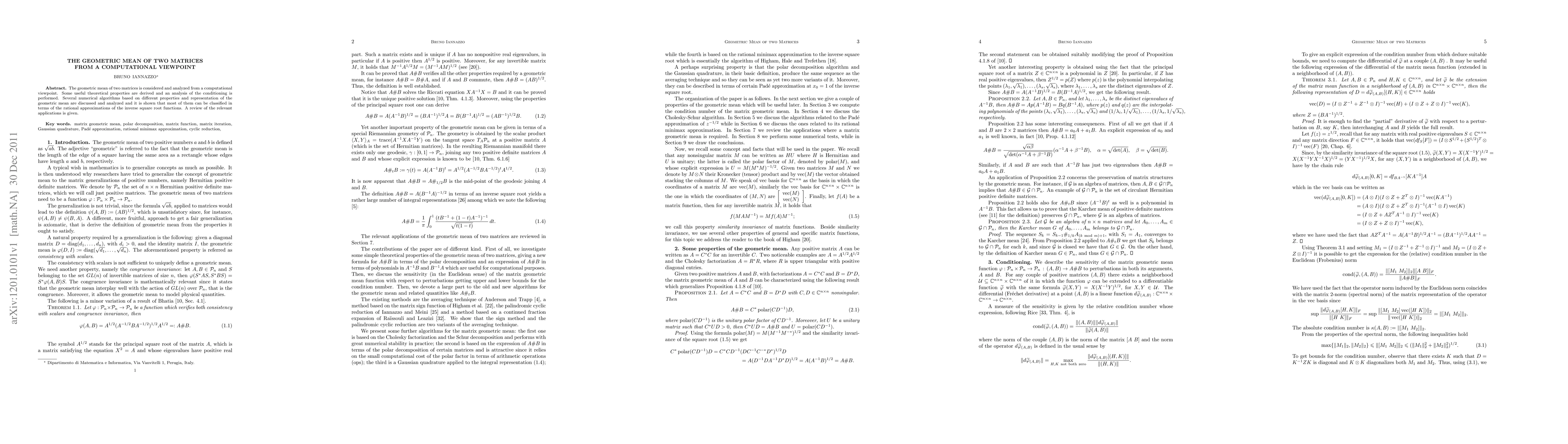 Researchers analyzed the geometric mean of two matrices from a computational perspective, deriving useful theoretical properties and conditioning analysis, and found that numerical algorithms can be classified based on rational approximations of inverse square root functions.