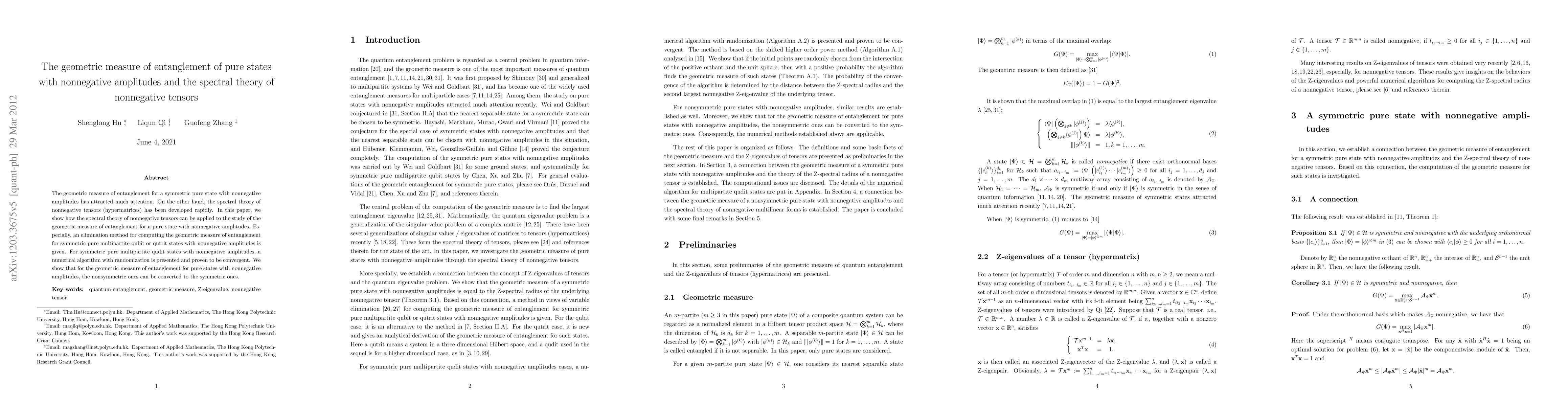This paper applies the spectral theory of nonnegative tensors to compute the geometric measure of entanglement for pure quantum states with nonnegative amplitudes. It provides an elimination method for symmetric multipartite qubit or qutrit states and a convergent numerical algorithm for qudit states, demonstrating the conversion of nonsymmetric to symmetric states for this measure.