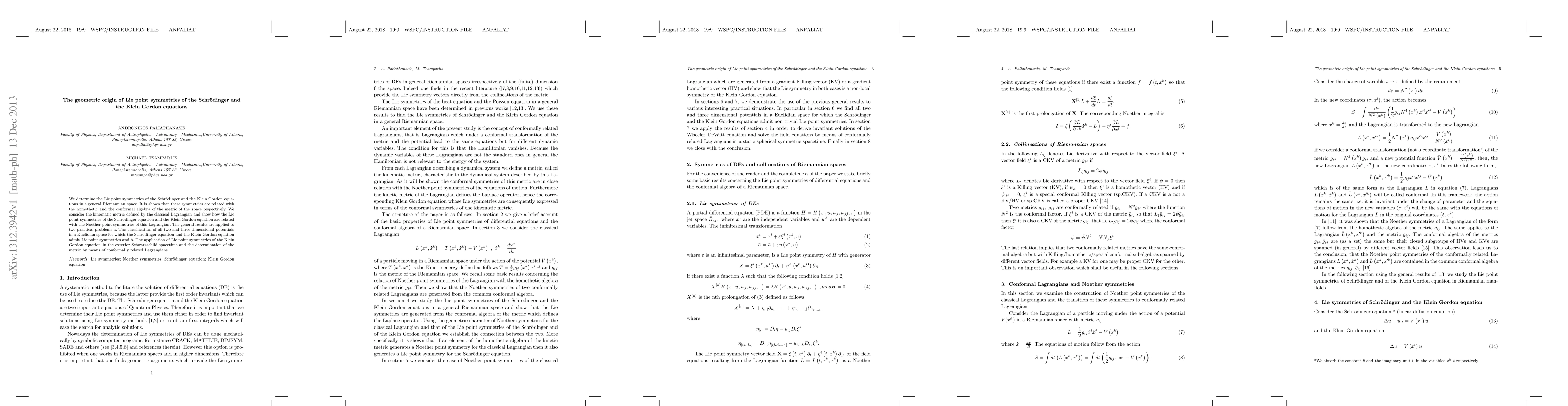This paper investigates the geometric origin of Lie point symmetries for the Schrödinger and Klein Gordon equations in Riemannian space, linking them to the homothetic and conformal algebra of the metric. It applies these findings to classify potentials in Euclidean space and determine the metric in the Schwarzschild spacetime using conformally related Lagrangians.