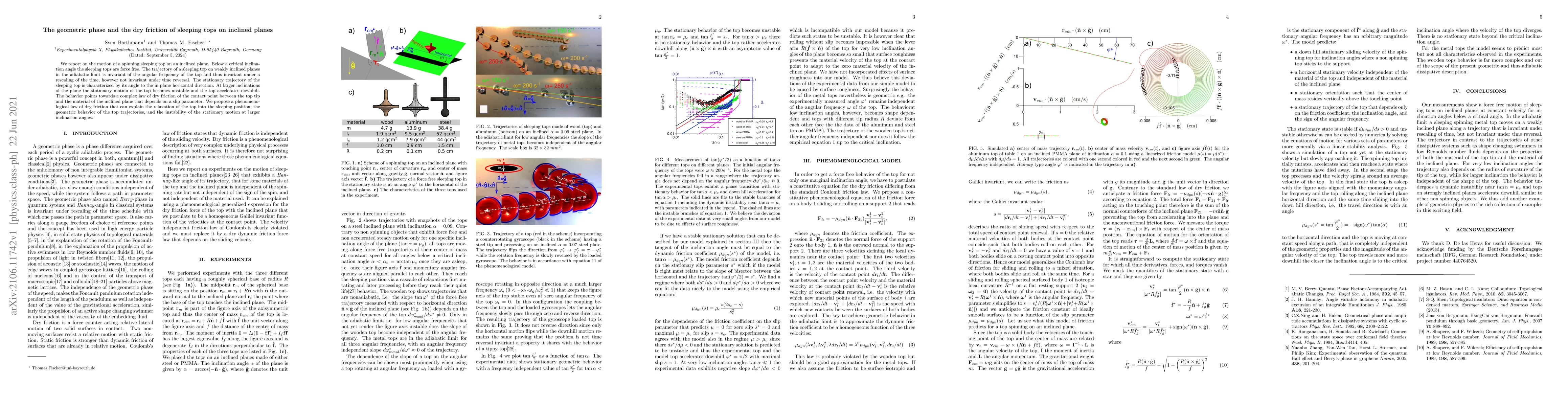 This paper investigates the dynamics of spinning sleeping tops on inclined planes, revealing that below a critical angle, their motion is force-free and invariant under time rescaling. At larger inclinations, the tops exhibit unstable motion and downhill acceleration, suggesting a complex dry friction law dependent on a slip parameter. The authors propose a phenomenological friction model to explain these behaviors.