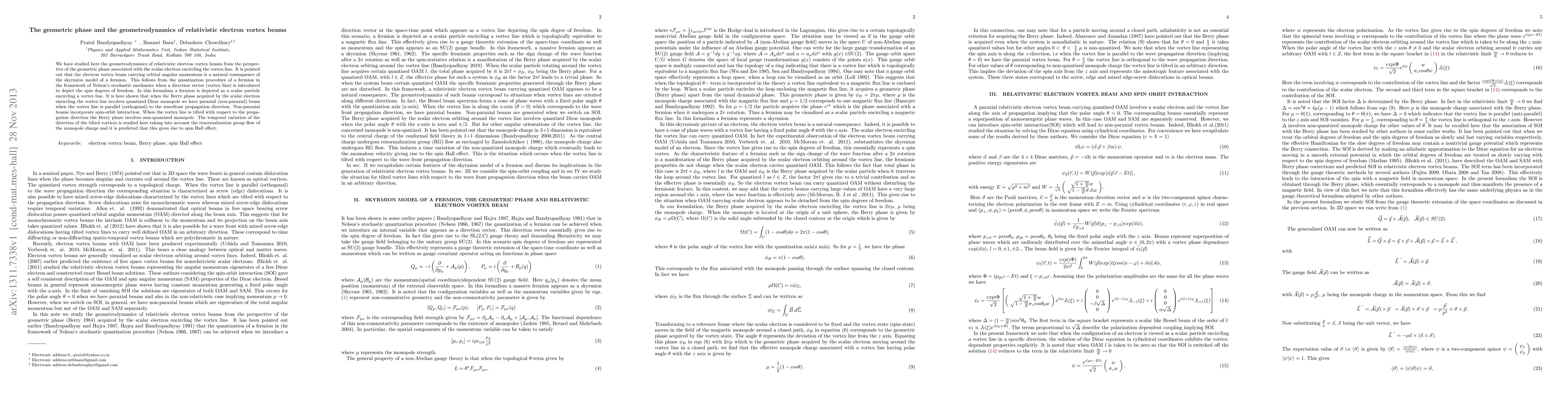 We have studied here the geometrodynamics of relativistic electron vortex beams from the perspective of the geometric phase associated with the scalar electron encircling the vortex line. It is pointed out that the electron vortex beam carrying orbital angular momentum is a natural consequence of the skyrmion model of a fermion. This follows from the quantization procedure of a fermion in the framework of Nelson's stochastic mechanics when a direction vector (vortex line) is introduced to depict the spin degrees of freedom. In this formalism a fermion is depicted as a scalar particle encircling a vortex line. It is here shown that when the Berry phase acquired by the scalar electron encircling the vortex line involves quantized Dirac monopole we have paraxial (non-paraxial) beam when the vortex line is parallel (orthogonal) to the wavefront propagation direction. Non-paraxial beams incorporate spin-orbit interaction. When the vortex line is tilted with respect to the propagation direction the Berry phase involves non-quantized monopole. The temporal variation of the direction of the tilted vortices is studied here taking into account the renormalization group flow of the monopole charge and it is predicted that this gives rise to spin Hall effect.