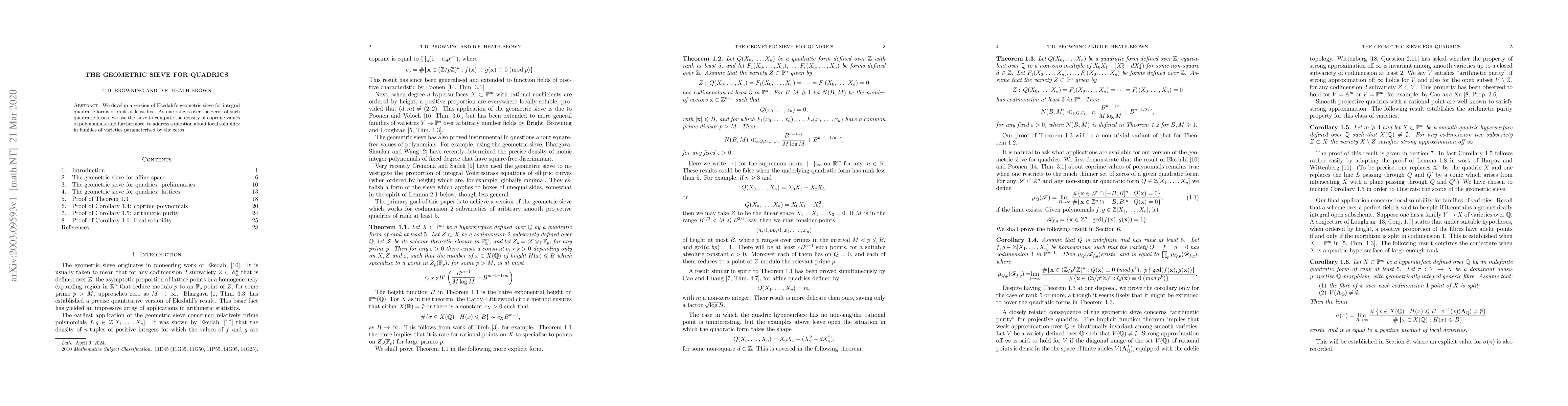 This paper introduces a geometric sieve for integral quadratic forms of rank five or higher, enabling the computation of the density of coprime values of polynomials and addressing local solubility questions in families of parameterized varieties.