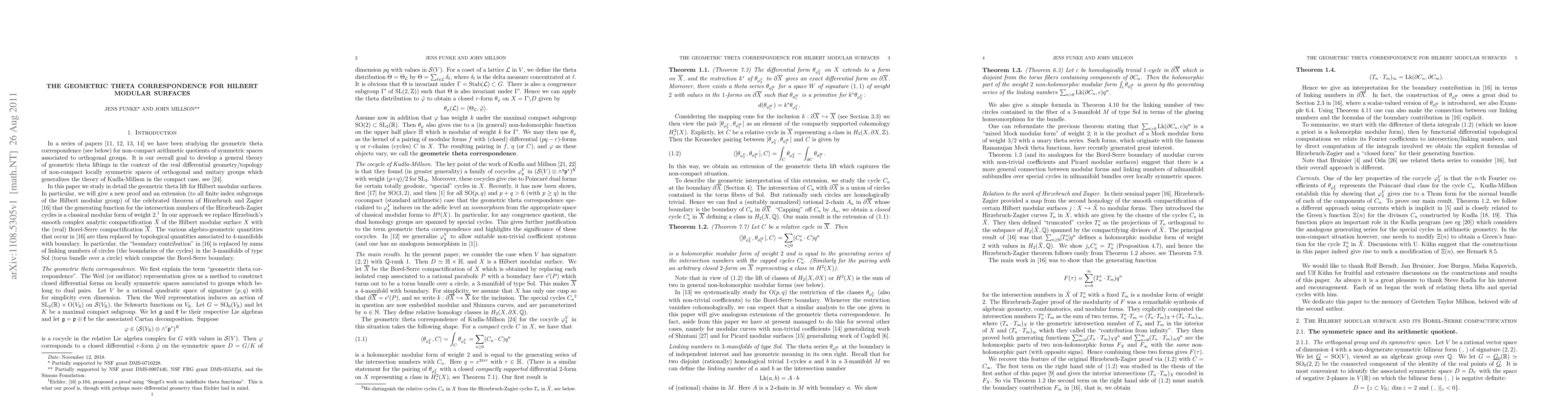 In a series of papers we have been studying the geometric theta correspondence for non-compact arithmetic quotients of symmetric spaces associated to orthogonal groups. It is our overall goal to develop a general theory of geometric theta liftings in the context of the real differential geometry/topology of non-compact locally symmetric spaces of orthogonal and unitary groups which generalizes the theory of Kudla-Millson in the compact case. In this paper we study in detail the geometric theta lift for Hilbert modular surfaces. In particular, we will give a new proof and an extension (to all finite index subgroups of the Hilbert modular group) of the celebrated theorem of Hirzebruch and Zagier that the generating function for the intersection numbers of the Hirzebruch-Zagier cycles is a classical modular form of weight 2. In our approach we replace Hirzebuch's smooth complex analytic compactification $\tilde{X}$ of the Hilbert modular surface $X$ with the (real) Borel-Serre compactification $\bar{X}$. The various algebro-geometric quantities are then replaced by topological quantities associated to 4-manifolds with boundary. In particular, the "boundary contribution" in Hirzebruch-Zagier is replaced by sums of linking numbers of circles (the boundaries of the cycles) in the 3-manifolds of type Sol (torus bundle over a circle) which comprise the Borel-Serre boundary.