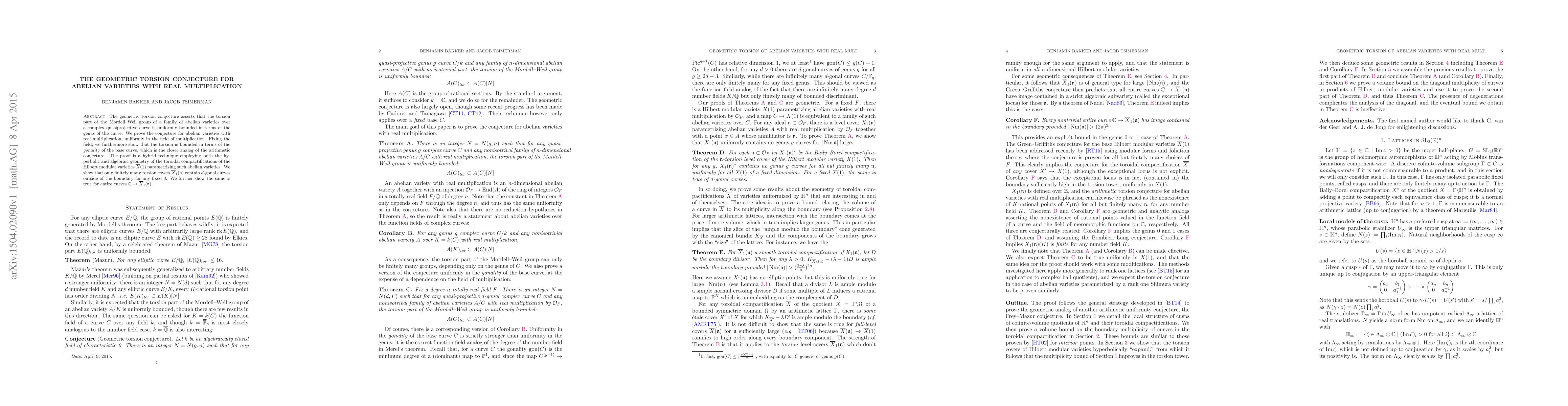 This paper proves the geometric torsion conjecture for abelian varieties with real multiplication, showing uniform bounds on the torsion part of their Mordell-Weil group in terms of the genus and gonality of the base curve. The proof leverages techniques from both hyperbolic and algebraic geometry.