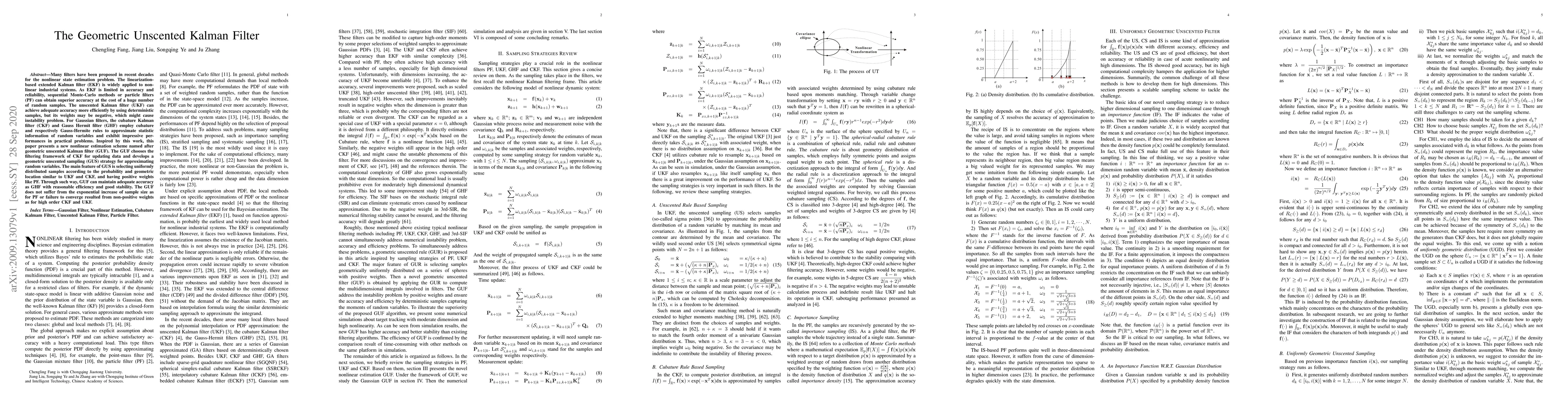 The paper introduces the geometric unscented Kalman filter (GUF), a new nonlinear state estimation method that combines the filtering framework of the cubature Kalman filter with a geometric unscented sampling strategy to achieve high accuracy, reasonable efficiency, and stability without the drawbacks of negative weights or exponential sample size growth.