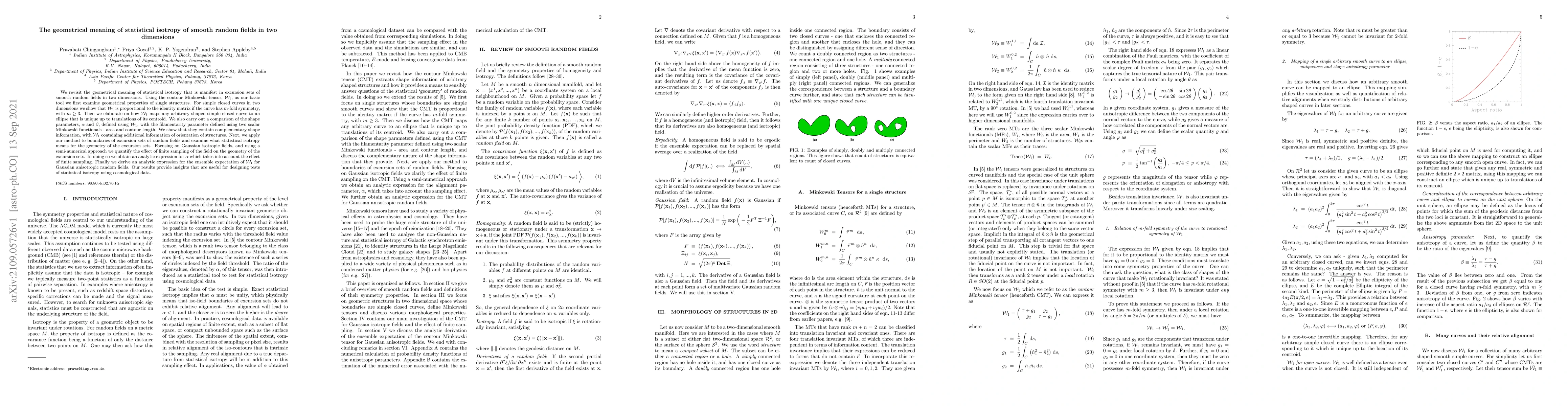 We revisit the geometrical meaning of statistical isotropy that is manifest in excursion sets of smooth random fields in two dimensions. Using the contour Minkowski tensor, $\W_1$, as our basic tool we first examine geometrical properties of single structures. For simple closed curves in two dimensions we show that $\W_1$ is proportional to the identity matrix if the curve has $m$-fold symmetry, with $m\ge 3$. Then we elaborate on how $\W_1$ maps any arbitrary shaped simple closed curve to an ellipse that is unique up to translations of its centroid. We also carry out a comparison of the shape parameters, $\alpha$ and $\beta$, defined using $\W_1$, with the filamentarity parameter defined using two scalar Minkowski functionals - area and contour length. We show that they contain complementary shape information, with $\W_1$ containing additional information of orientation of structures. Next, we apply our method to boundaries of excursion sets of random fields and examine what statistical isotropy means for the geometry of the excursion sets. Focusing on Gaussian isotropic fields, and using a semi-numerical approach we quantify the effect of finite sampling of the field on the geometry of the excursion sets. In doing so we obtain an analytic expression for $\alpha$ which takes into account the effect of finite sampling. Finally we derive an analytic expression for the ensemble expectation of $\W_1$ for Gaussian anisotropic random fields. Our results provide insights that are useful for designing tests of statistical isotropy using cosmological data.