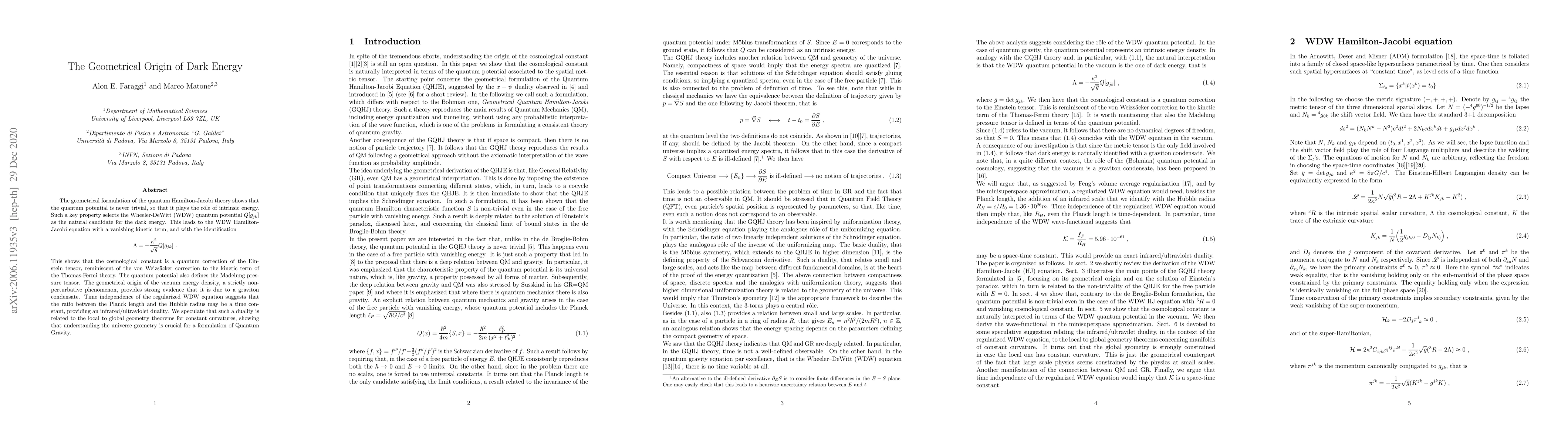 The geometrical formulation of the quantum Hamilton-Jacobi theory shows that the quantum potential is never trivial, so that it plays the r\^ole of intrinsic energy. Such a key property selects the Wheeler-DeWitt (WDW) quantum potential $Q[g_{jk}]$ as the natural candidate for the dark energy. This leads to the WDW Hamilton-Jacobi equation with a vanishing kinetic term, and with the identification $$ \Lambda=-\frac{\kappa^2}{\sqrt{\bar g}}Q[g_{jk}] \ . $$ This shows that the cosmological constant is a quantum correction of the Einstein tensor, reminiscent of the von Weizs\"acker correction to the kinetic term of the Thomas-Fermi theory. The quantum potential also defines the Madelung pressure tensor. The geometrical origin of the vacuum energy density, a strictly non-perturbative phenomenon, provides strong evidence that it is due to a graviton condensate. Time independence of the regularized WDW equation suggests that the ratio between the Planck length and the Hubble radius may be a time constant, providing an infrared/ultraviolet duality. We speculate that such a duality is related to the local to global geometry theorems for constant curvatures, showing that understanding the universe geometry is crucial for a formulation of Quantum Gravity.
