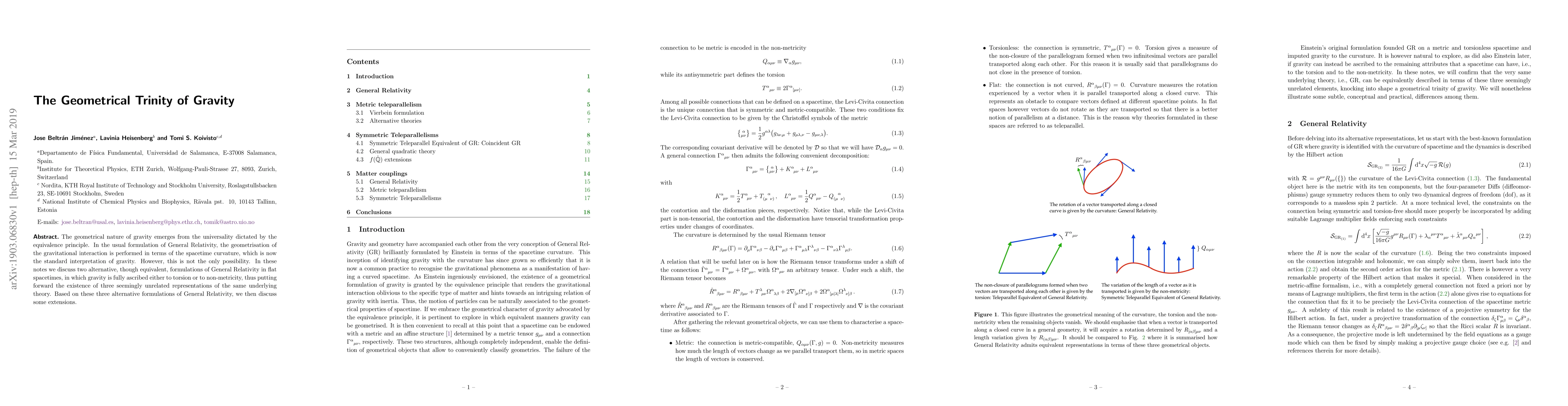 This paper explores alternative formulations of General Relativity in flat spacetimes, where gravity is represented by torsion or non-metricity, alongside the standard spacetime curvature model, revealing a geometrical trinity of gravity interpretations. These formulations lead to discussions on potential extensions of the theory.
