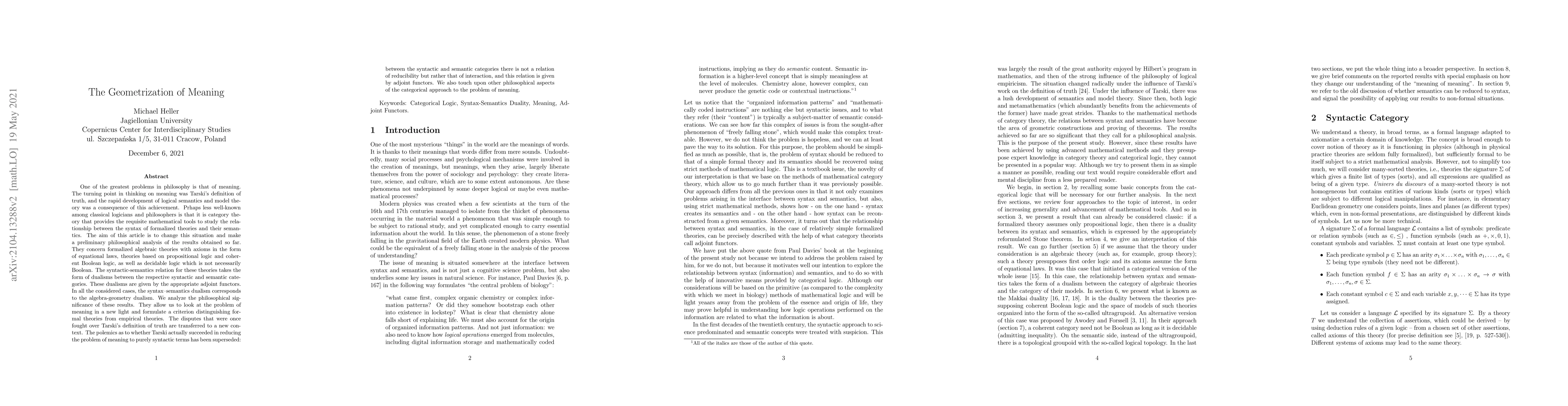 One of the greatest problems in philosophy is that of meaning. The turning point in thinking on meaning was Tarski's definition of truth, and the rapid development of logical semantics and model theory was a consequence of this achievement. Perhaps less well-known among classical logicians and philosophers is that it is category theory that provides adequate mathematical tools to study the relationship between the syntax of formalized theories and their semantics. The aim of this article is to change this situation and make a preliminary philosophical analysis of the results obtained so far. They concern formalized algebraic theories with axioms in the form of equational laws, theories based on propositional logic and coherent Boolean logic, as well as decidable logic which is not necessarily Boolean. The syntactic-semantics relation for these theories takes the form of dualisms between the respective syntactic and semantic categories. These dualisms are given by the appropriate adjoint functors. In all the considered cases, the syntax--semantics dualism corresponds to the algebra-geometry dualism. We analyze the philosophical significance of these results. They allow us to look at the problem of meaning in a new light and formulate a criterion distinguishing formal theories from empirical theories. The disputes that were once fought over Tarski's definition of truth are transferred to a new context. The polemics as to whether Tarski actually succeeded in reducing the problem of meaning to purely syntactic terms has been superseded: between the syntactic and semantic categories there is not a relation of reducibility but rather that of interaction, and this relation is given by adjoint functors. We also touch upon other philosophical aspects of the categorical approach to the problem of meaning.