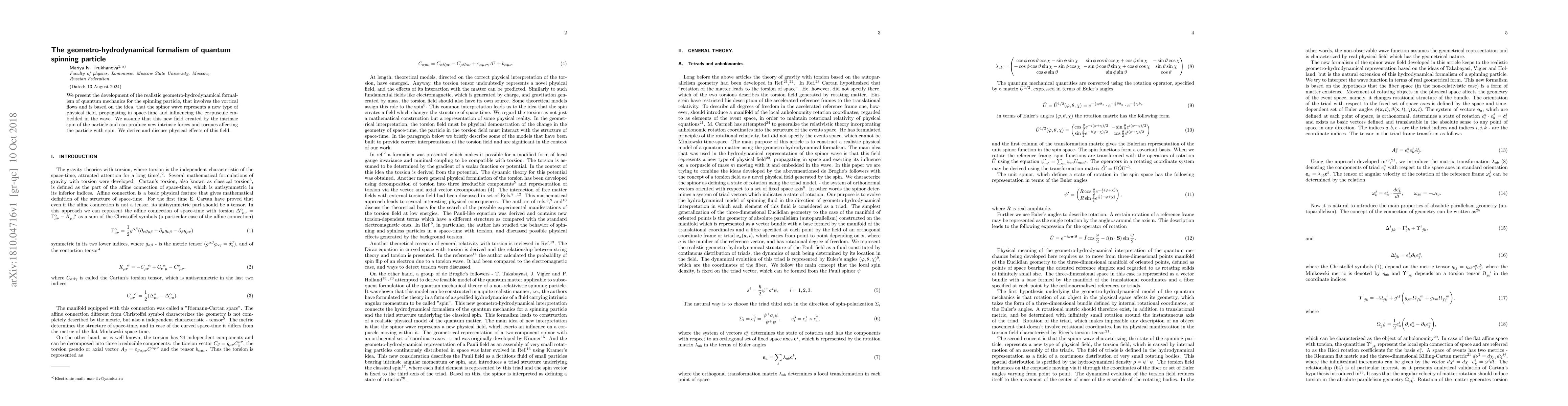 We present the development of the realistic geometro-hydrodynamical formalism of quantum mechanics for the spinning particle, that involves the vortical flows and is based on the idea, that the spinor wave represents a new type of physical field, propagating in space-time and influencing the corpuscule embedded in the wave. We assume that this new field created by the intrinsic spin of the particle and can produce new intrinsic forces and torques affecting the particle with spin. We derive and discuss physical effects of this field.