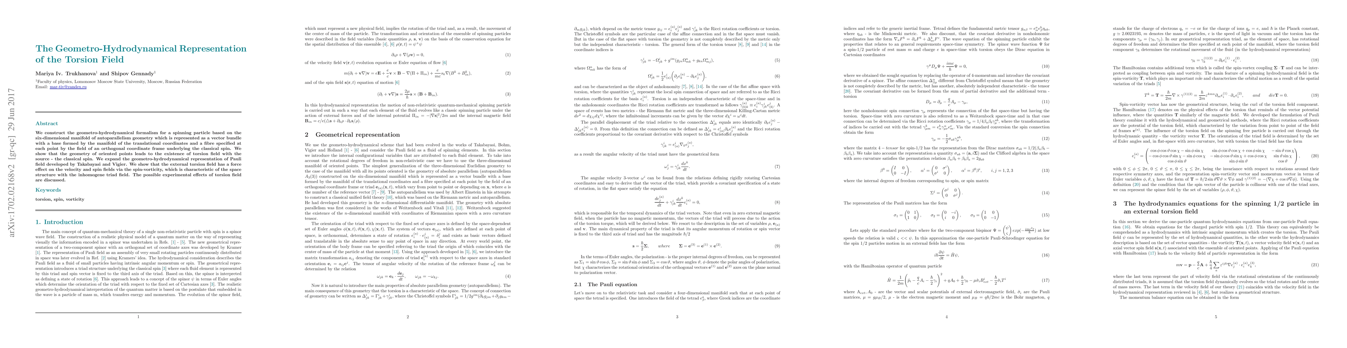 This paper develops a geometro-hydrodynamical formalism for a spinning particle using a six-dimensional manifold, showing that it leads to a torsion field sourced by classical spin. It extends the Pauli field representation and discusses the effects of torsion fields on velocity and spin fields.