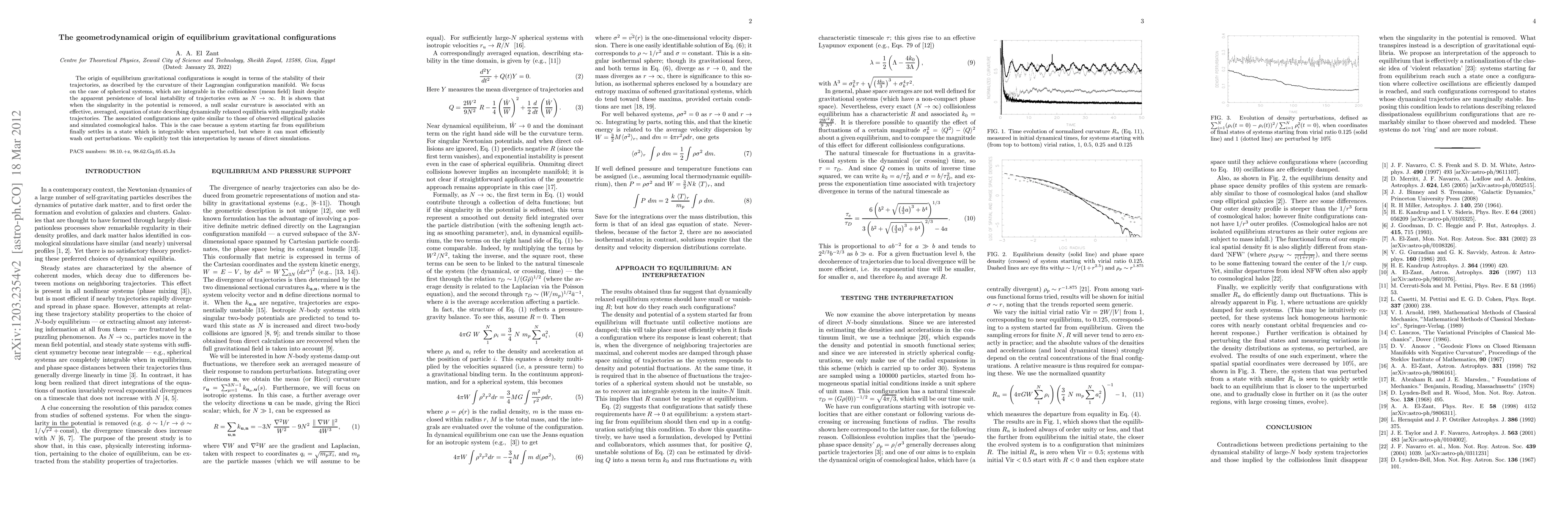 This research explores the origin of stable gravitational configurations in spherical systems, demonstrating that they arise from the stability of trajectories in their Lagrangian manifold. It reveals that removing singularities in potential leads to a null scalar curvature, describing equilibria similar to observed elliptical galaxies and cosmological halos. The findings are supported by direct simulations.