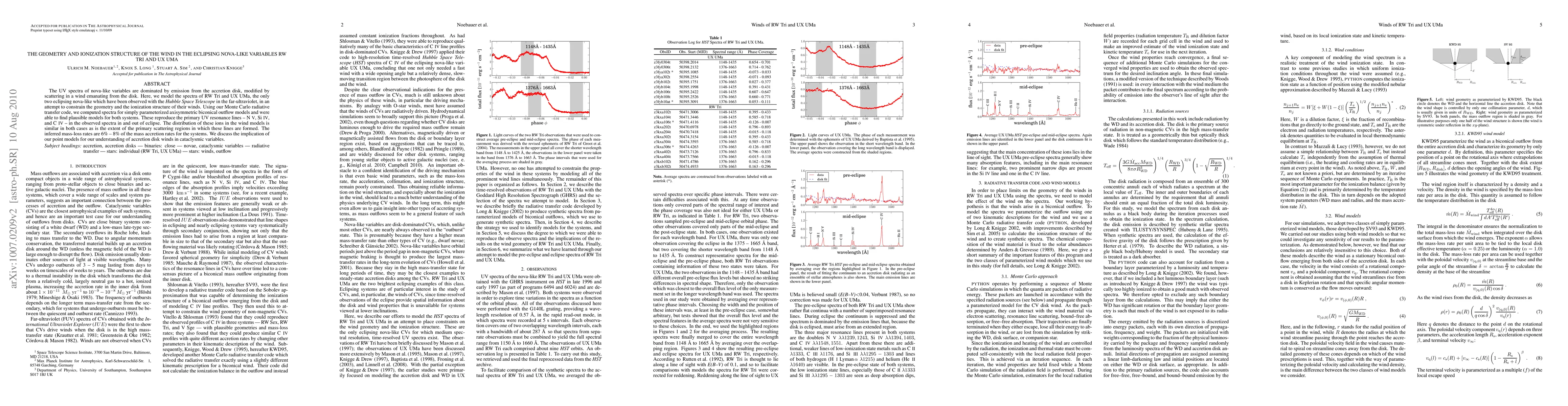 This study models the UV spectra of eclipsing nova-like variables RW Tri and UX UMa to determine the geometry and ionization structure of their winds. The findings suggest axisymmetric biconical outflow models that reproduce observed UV lines and imply mass loss rates of 6% to 8% of the accretion rates, enhancing our understanding of accretion disk winds in cataclysmic variables.