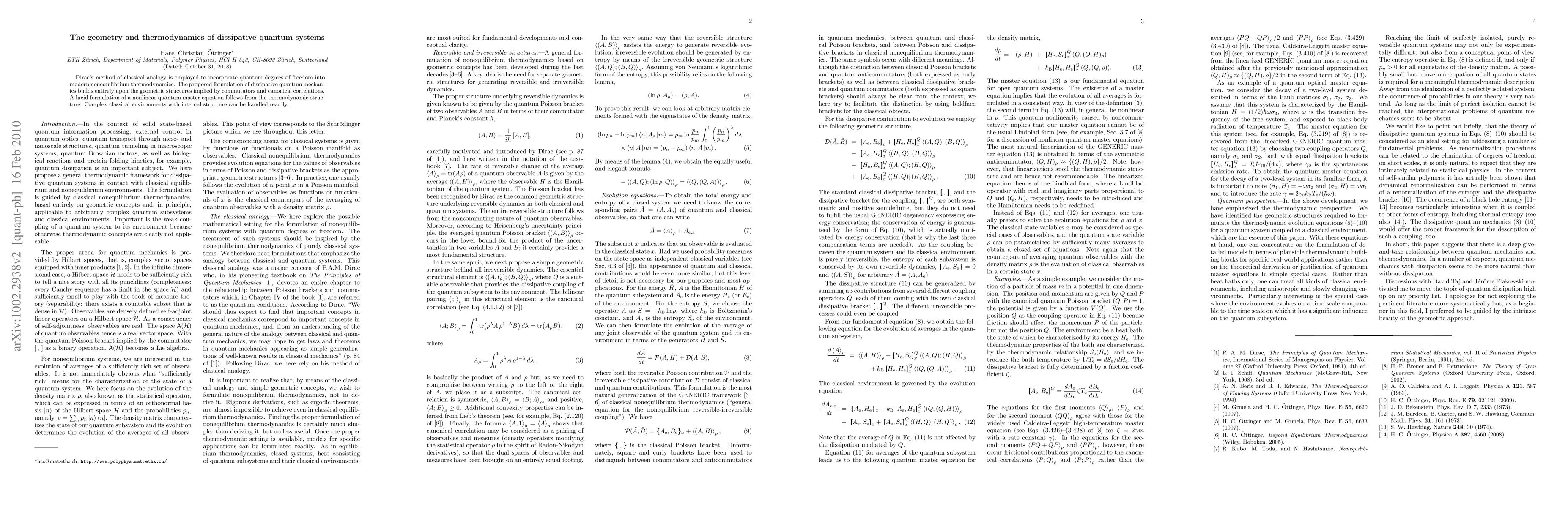 Dirac's method of classical analogy is employed to incorporate quantum degrees of freedom into modern nonequilibrium thermodynamics. The proposed formulation of dissipative quantum mechanics builds entirely upon the geometric structures implied by commutators and canonical correlations. A lucid formulation of a nonlinear quantum master equation follows from the thermodynamic structure. Complex classical environments with internal structure can be handled readily.