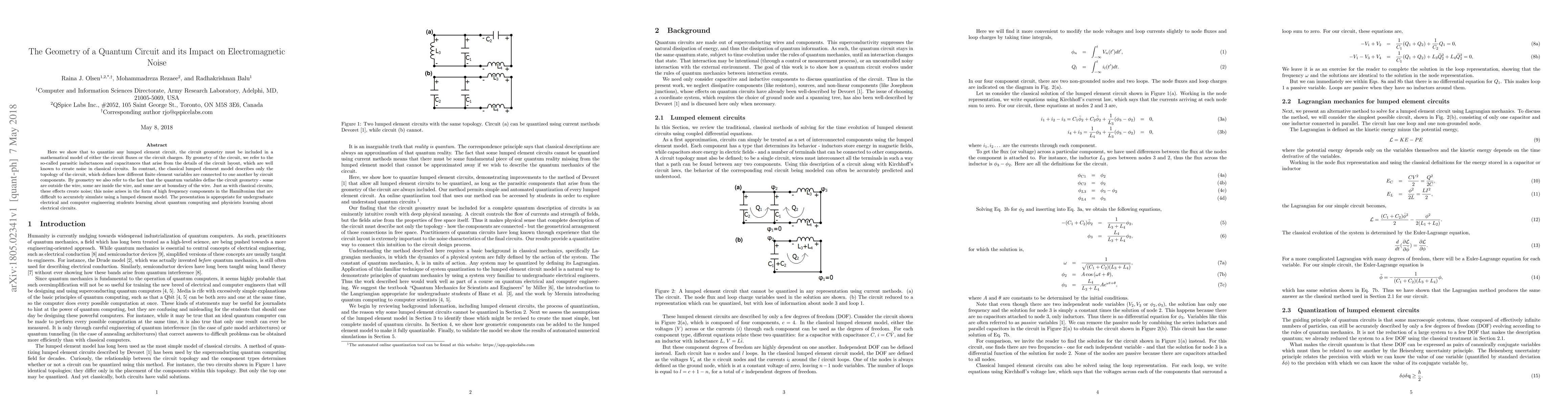 Here we show that to quantize any lumped element circuit, the circuit geometry must be included in a mathematical model of either the circuit fluxes or the circuit charges. By geometry of the circuit, we refer to the so-called parasitic inductances and capacitances that arise from the details of the circuit layout, which are well known to create noise in classical circuits. In contrast, the classical lumped element model describes only the topology of the circuit, which defines how different finite element variables are connected to one another by circuit components. By geometry we also refer to the fact that the quantum variables define the circuit geometry - some are outside the wire, some are inside the wire, and some are at boundary of the wire. Just as with classical circuits, these effects create noise; this noise arises in the form of high frequency components in the Hamiltonian that are difficult to accurately simulate using a lumped element model. The presentation is appropriate for undergraduate electrical and computer engineering students learning about quantum computing and physicists learning about electrical circuits.