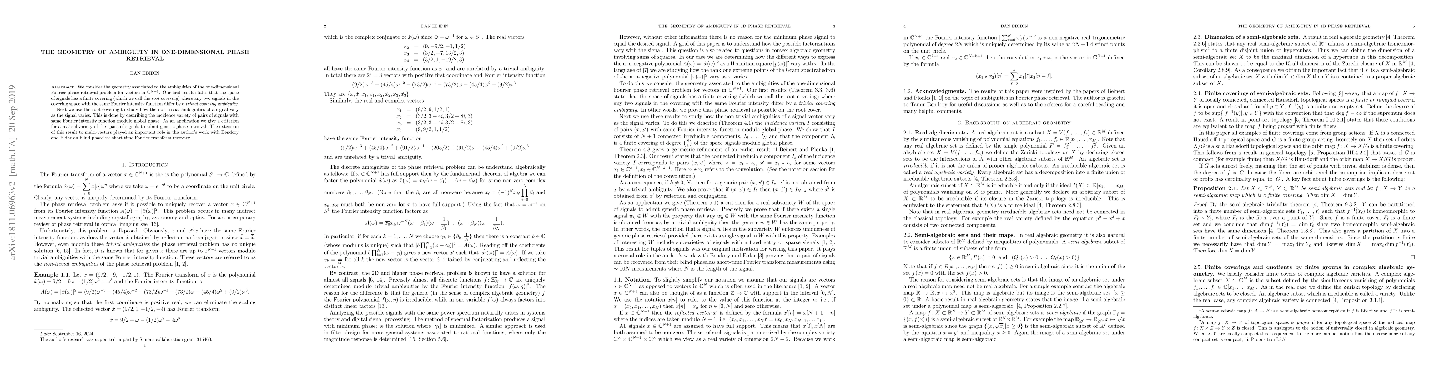 We consider the geometry associated to the ambiguities of the one-dimensional Fourier phase retrieval problem for vectors in ${\mathbb C}^{N+1}$. Our first result states that the space of signals has a finite covering (which we call the root covering) where any two signals in the covering space with the same Fourier intensity function differ by a trivial covering ambiguity. Next we use the root covering to study how the non-trivial ambiguities of a signal vary as the signal varies. This is done by describing of the incidence variety of pairs of signals with same fourier intensity function modulo global phase. As an application we give a criterion for a real subvariety of the space of signals to admit generic phase retrieval. The extension of this result to multi-vectors played an important role in the author's work with Bendory and Eldar on blind phaseless short-time fourier transform recovery.