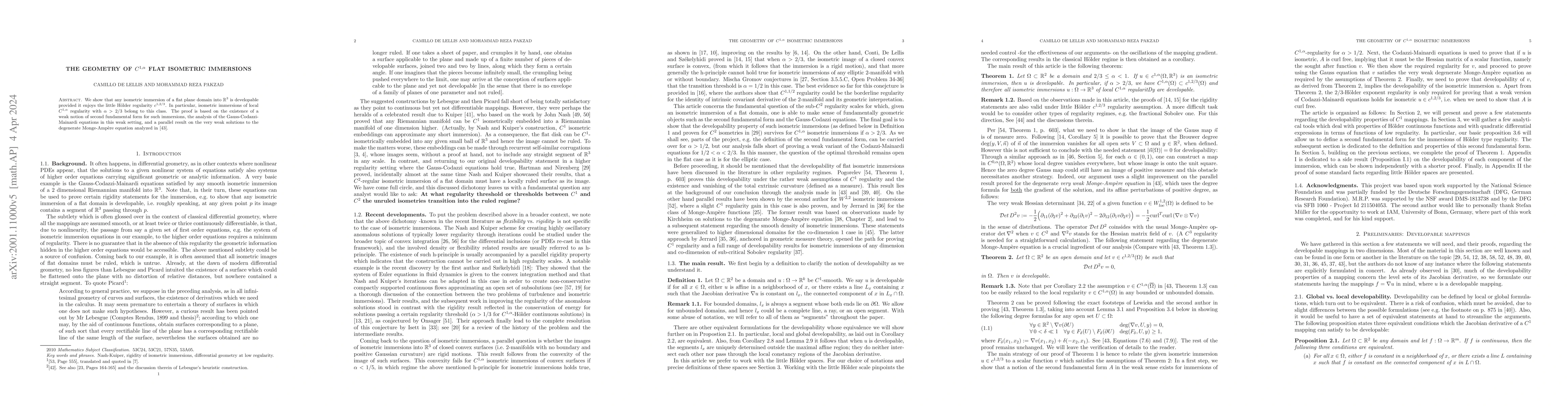 Summary: This paper proves that any $C^{1,\alpha}$ flat isometric immersion of a plane into $\mathbb{R}^3$ is developable when $\alpha > 2/3$, leveraging a weak second fundamental form, Gauss-Codazzi-Mainardi equations, and results on degenerate Monge-Ampère equations.