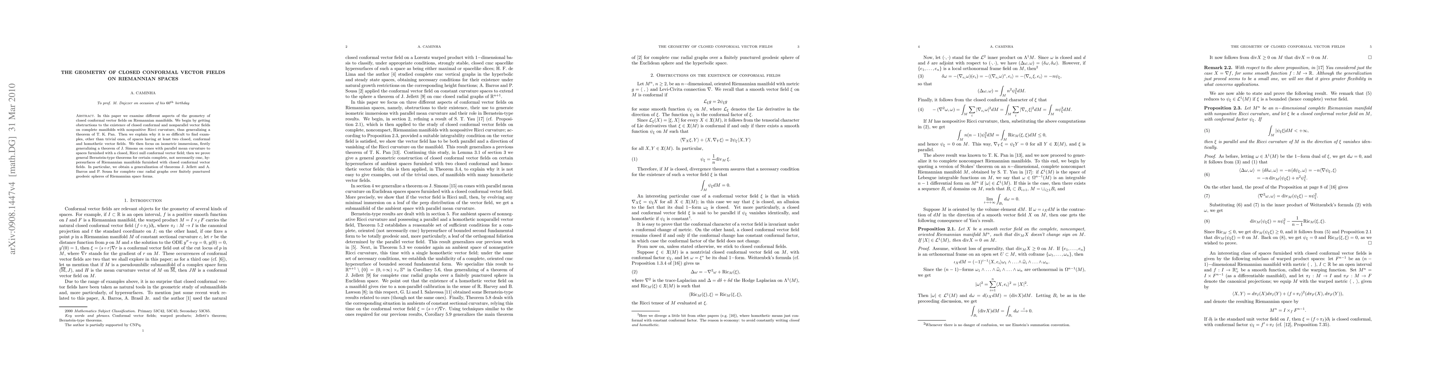 This paper explores the geometry of closed conformal vector fields on Riemannian manifolds, focusing on obstructions to their existence in complete manifolds with nonpositive Ricci curvature and proving Bernstein-type theorems for certain hypersurfaces with such vector fields. It also extends results on isometric immersions and generalizes theorems related to complete cmc radial graphs.