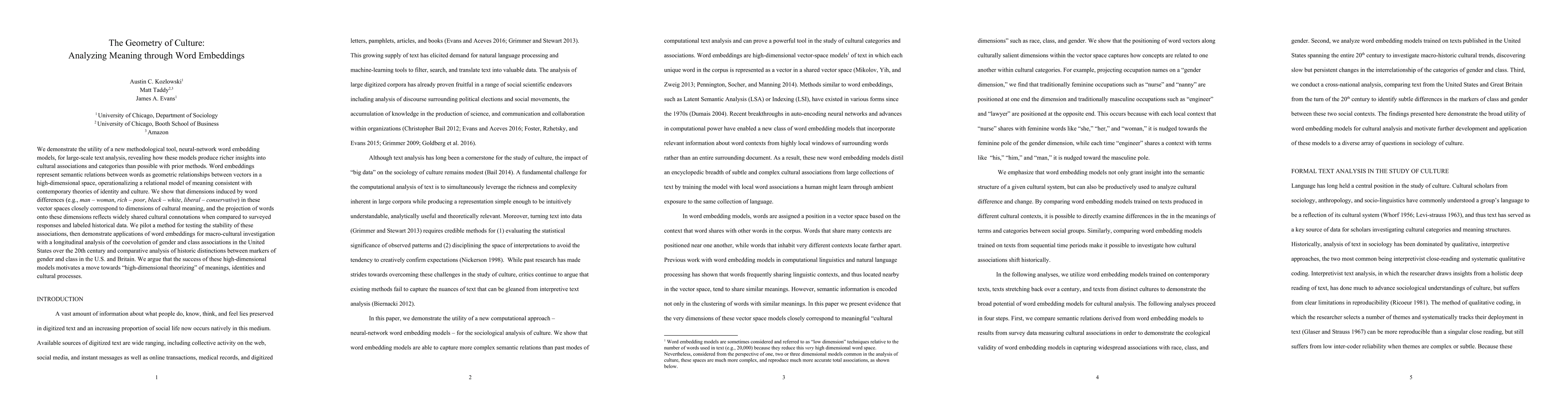 This paper explores the use of neural-network word embedding models to analyze cultural meanings through geometric relationships in high-dimensional vector spaces, demonstrating their effectiveness in revealing cultural associations and categories. The study applies these models to investigate the coevolution of gender and class in the U.S. over the 20th century and contrasts cultural distinctions between the U.S. and Britain.