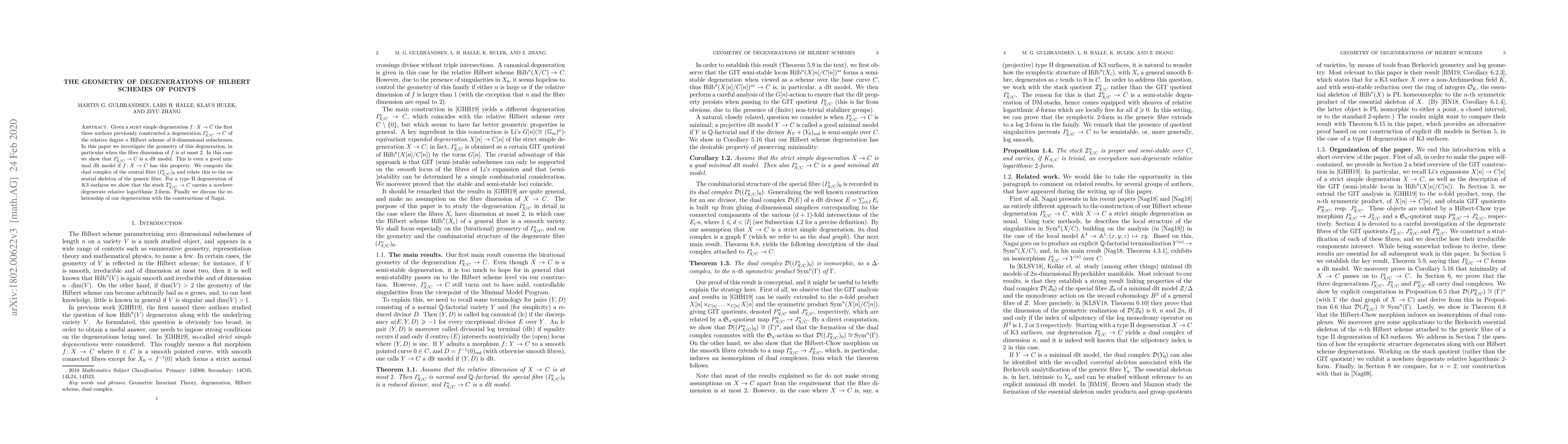 Given a strict simple degeneration $f \colon X\to C$ the first three authors previously constructed a degeneration $I^n_{X/C} \to C$ of the relative degree $n$ Hilbert scheme of $0$-dimensional subschemes. In this paper we investigate the geometry of this degeneration, in particular when the fibre dimension of $f$ is at most $2$. In this case we show that $I^n_{X/C} \to C$ is a dlt model. This is even a good minimal dlt model if $f \colon X \to C$ has this property. We compute the dual complex of the central fibre $(I^n_{X/C})_0$ and relate this to the essential skeleton of the generic fibre. For a type II degeneration of $K3$ surfaces we show that the stack ${\mathcal I}^n_{X/C} \to C$ carries a nowhere degenerate relative logarithmic $2$-form. Finally we discuss the relationship of our degeneration with the constructions of Nagai.