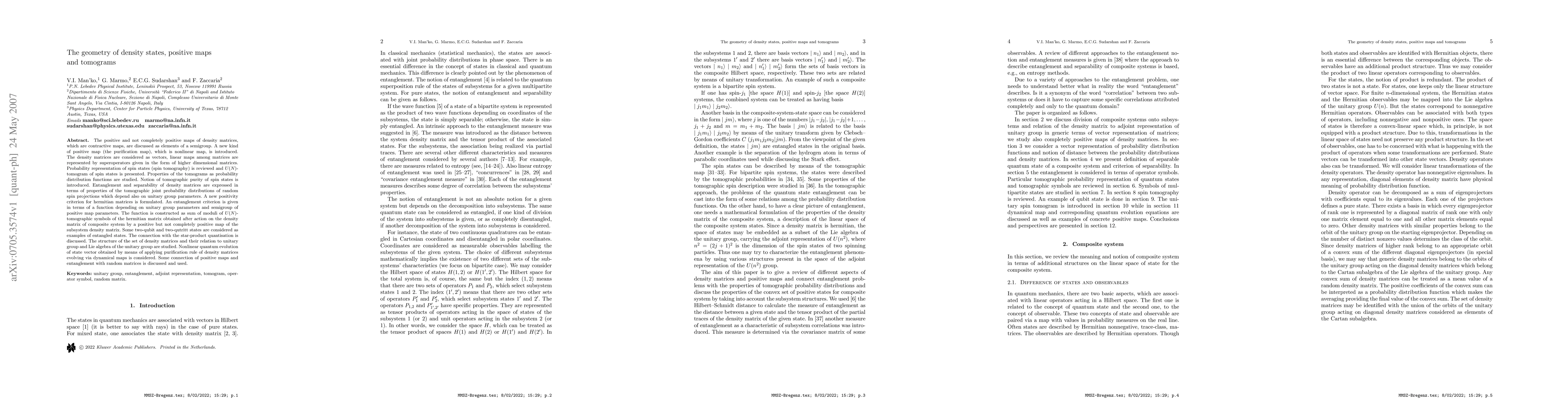 This paper explores the geometry of density matrices through positive and not completely positive maps, introducing a new purification map. It studies tomographic representations of spin states, including U(N)-tomograms, and develops criteria for entanglement and separability based on tomographic joint probability distributions. The work also formulates a new positivity criterion for Hermitian matrices and connects these concepts to star-product quantization and random matrices.