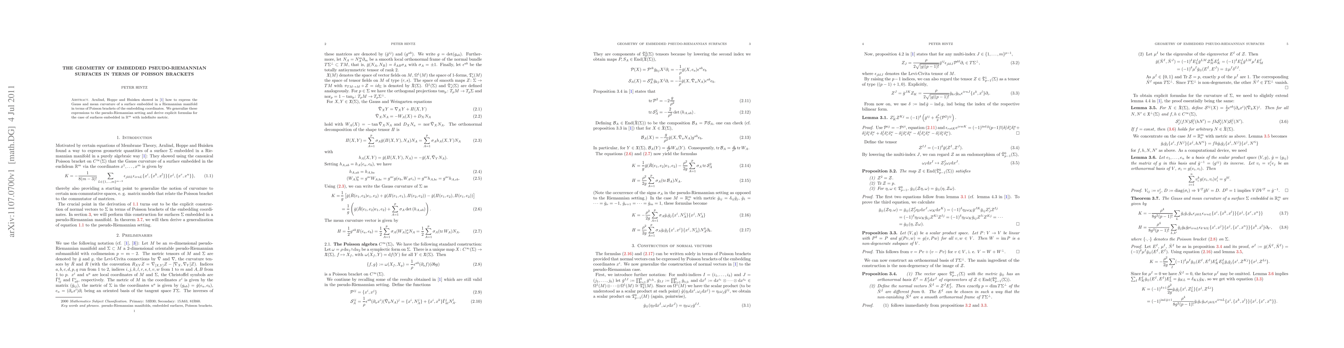 Arnlind, Hoppe and Huisken showed how to express the Gauss and mean curvature of a surface embedded in a Riemannian manifold in terms of Poisson brackets of the embedding coordinates. We generalize these expressions to the pseudo-Riemannian setting and derive explicit formulas for the case of surfaces embedded in $\R^m$ with indefinite metric.