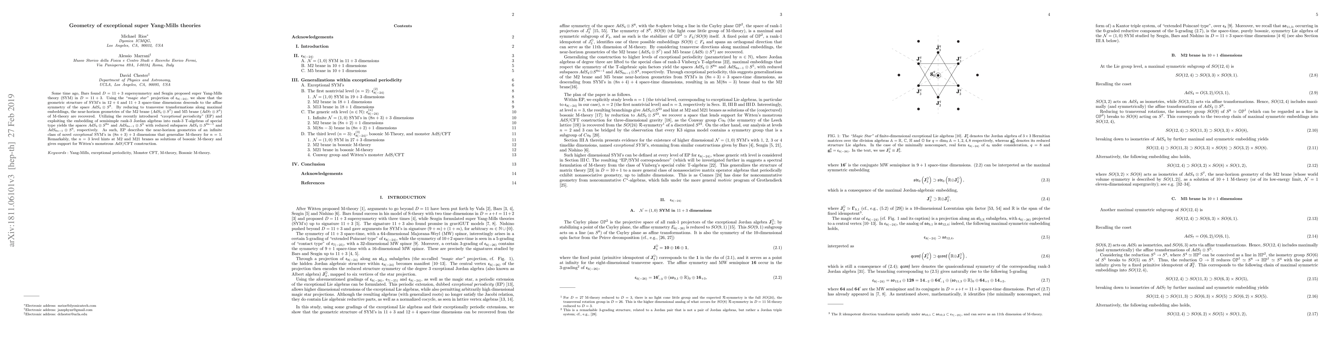 Some time ago, Sezgin, Bars and Nishino have proposed super Yang-Mills theories (SYM's) in $D=11+3$ and beyond. Using the "Magic Star" projection of $\mathfrak{e}_{8(-24)}$, we show that the geometric structure of SYM's in $11+3$ and $12+4$ space-time dimensions is recovered from the affine symmetry of the space $AdS_{4}\otimes S^{8}$, with the $8$-sphere being a line in the Cayley plane. By reducing to transverse transformations, along maximal embeddings, the near horizon geometries of the M2-brane ($AdS_{4}\otimes S^{7}$) and M5-brane ($AdS_{7}\otimes S^{4}$) are recovered. Generalizing the construction to higher, generic levels of the recently introduced "Exceptional Periodicity" (EP) and exploiting the embedding of semi-simple rank-3 Jordan algebras into rank-3 T-algebras of special type, yields the spaces $AdS_{4}\otimes S^{8n}$ and $AdS_{7}\otimes S^{8n-3}$, with reduced subspaces $AdS_{4}\otimes S^{8n-1}$ and $AdS_{7}\otimes S^{8n-4}$, respectively. Within EP, this suggests generalizations of the near horizon geometry of the M2-brane and its Hodge (magnetic) duals, related to $(1,0)$ SYM's in $(8n+3)+3$ dimensions, constituting a particular class of novel higher-dimensional SYM's, which we name exceptional SYM's. Remarkably, the $n=3$ level gives $AdS_{4}\otimes S^{23}$, hinting at M2 and M21 branes as solutions of bosonic M-theory, and reduction to $AdS_{3}\otimes S^{23}$ gives support for Witten's monstrous $AdS$/CFT construction.