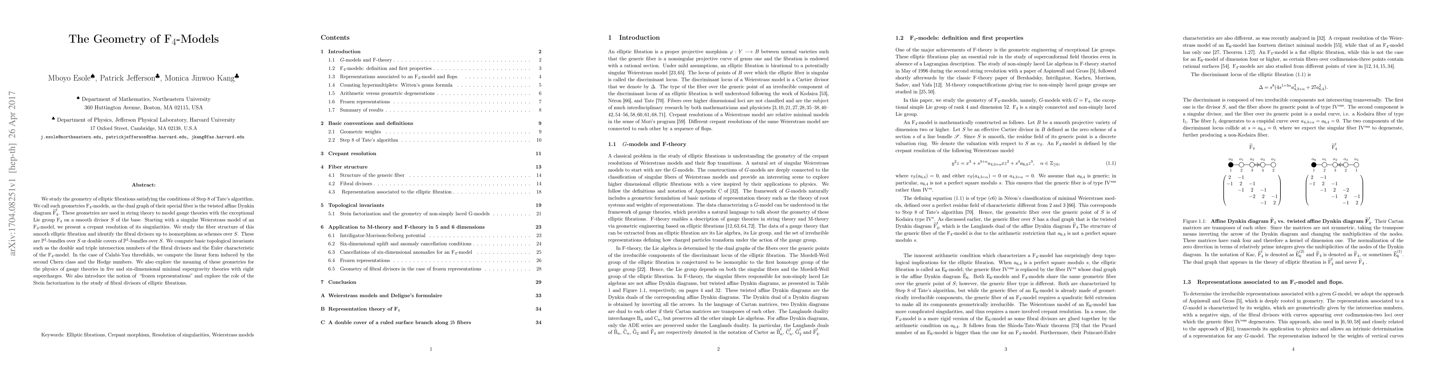 We study the geometry of elliptic fibrations satisfying the conditions of Step 8 of Tate's algorithm. We call such geometries F$_4$-models, as the dual graph of their special fiber is the twisted affine Dynkin diagram $\widetilde{\text{F}}_4^t$. These geometries are used in string theory to model gauge theories with the exceptional Lie group F$_4$ on a smooth divisor $S$ of the base. Starting with a singular Weierstrass model of an F$_4$-model, we present a crepant resolution of its singularities. We study the fiber structure of this smooth elliptic fibration and identify the fibral divisors up to isomorphism as schemes over $S$. These are $\mathbb{P}^1$-bundles over $S$ or double covers of $\mathbb{P}^1$-bundles over $S$. We compute basic topological invariants such as the double and triple intersection numbers of the fibral divisors and the Euler characteristic of the F$_4$-model. In the case of Calabi-Yau threefolds, we compute the linear form induced by the second Chern class and the Hodge numbers. We also explore the meaning of these geometries for the physics of gauge theories in five and six-dimensional minimal supergravity theories with eight supercharges. We also introduce the notion of "frozen representations" and explore the role of the Stein factorization in the study of fibral divisors of elliptic fibrations.