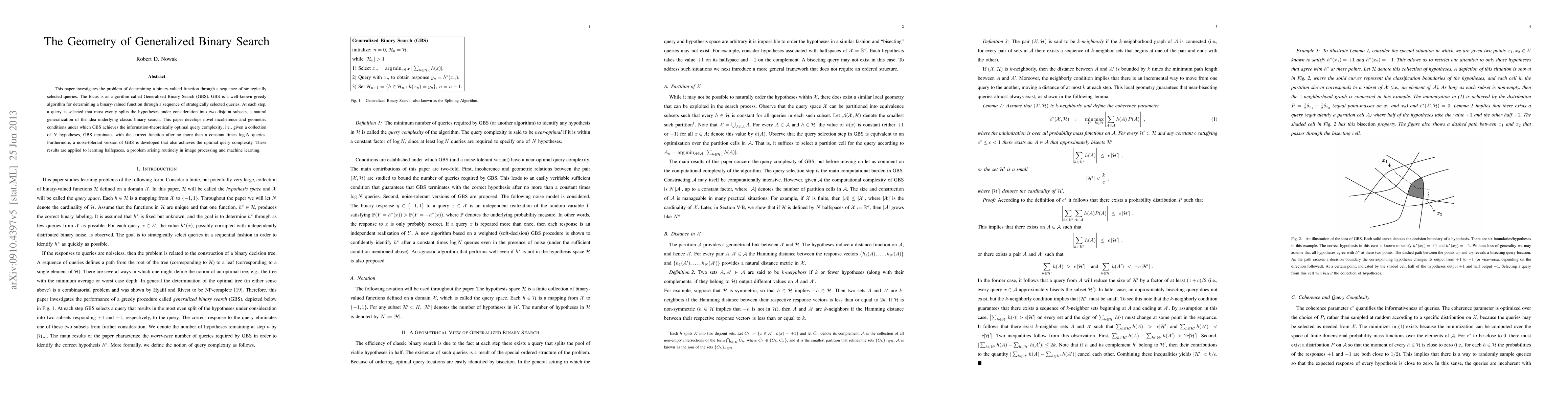 This paper investigates the problem of determining a binary-valued function through a sequence of strategically selected queries. The focus is an algorithm called Generalized Binary Search (GBS). GBS is a well-known greedy algorithm for determining a binary-valued function through a sequence of strategically selected queries. At each step, a query is selected that most evenly splits the hypotheses under consideration into two disjoint subsets, a natural generalization of the idea underlying classic binary search. This paper develops novel incoherence and geometric conditions under which GBS achieves the information-theoretically optimal query complexity; i.e., given a collection of N hypotheses, GBS terminates with the correct function after no more than a constant times log N queries. Furthermore, a noise-tolerant version of GBS is developed that also achieves the optimal query complexity. These results are applied to learning halfspaces, a problem arising routinely in image processing and machine learning.
