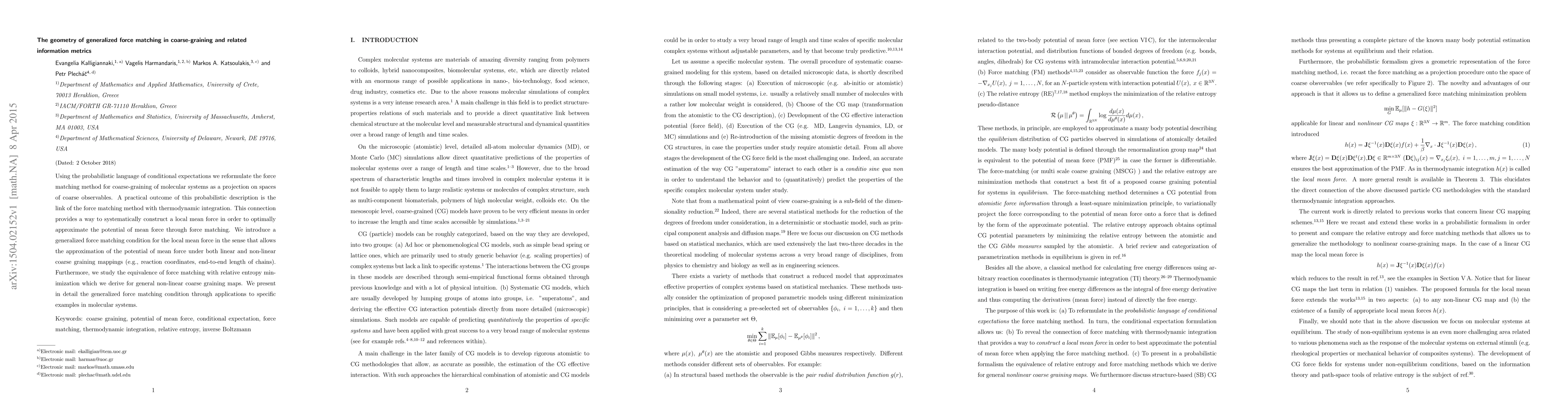 This paper reformulates the force matching method for molecular system coarse-graining using conditional expectations, linking it to thermodynamic integration and providing a systematic approach to construct a local mean force. It introduces a generalized force matching condition applicable to both linear and non-linear coarse graining mappings, and explores its equivalence to relative entropy minimization.