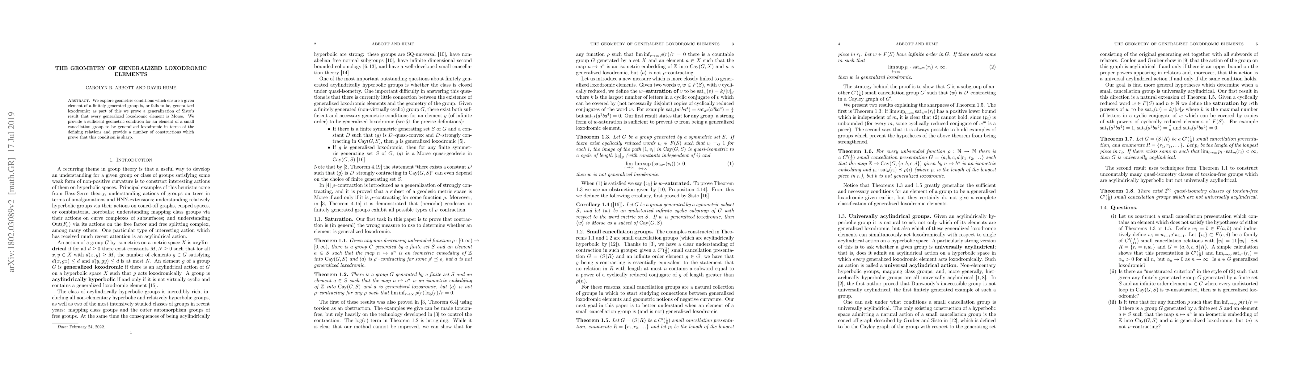 We explore geometric conditions which ensure a given element of a finitely generated group is, or fails to be, generalized loxodromic; as part of this we prove a generalization of Sisto's result that every generalized loxodromic element is Morse. We provide a sufficient geometric condition for an element of a small cancellation group to be generalized loxodromic in terms of the defining relations and provide a number of constructions which prove that this condition is sharp.