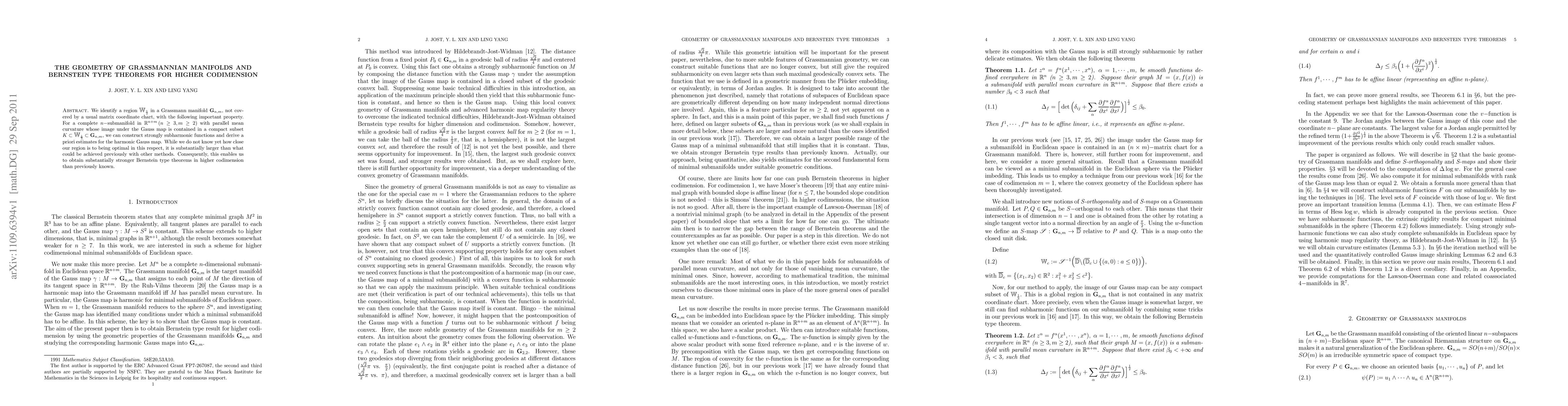 We identify a region $\Bbb{W}_{\f{1}{3}}$ in a Grassmann manifold $\grs{n}{m}$, not covered by a usual matrix coordinate chart, with the following important property. For a complete $n-$submanifold in $\ir{n+m} \, (n\ge 3, m\ge2)$ with parallel mean curvature whose image under the Gauss map is contained in a compact subset $K\subset\Bbb{W}_{\f{1}{3}}\subset\grs{n}{m}$, we can construct strongly subharmonic functions and derive a priori estimates for the harmonic Gauss map. While we do not know yet how close our region is to being optimal in this respect, it is substantially larger than what could be achieved previously with other methods. Consequently, this enables us to obtain substantially stronger Bernstein type theorems in higher codimension than previously known.