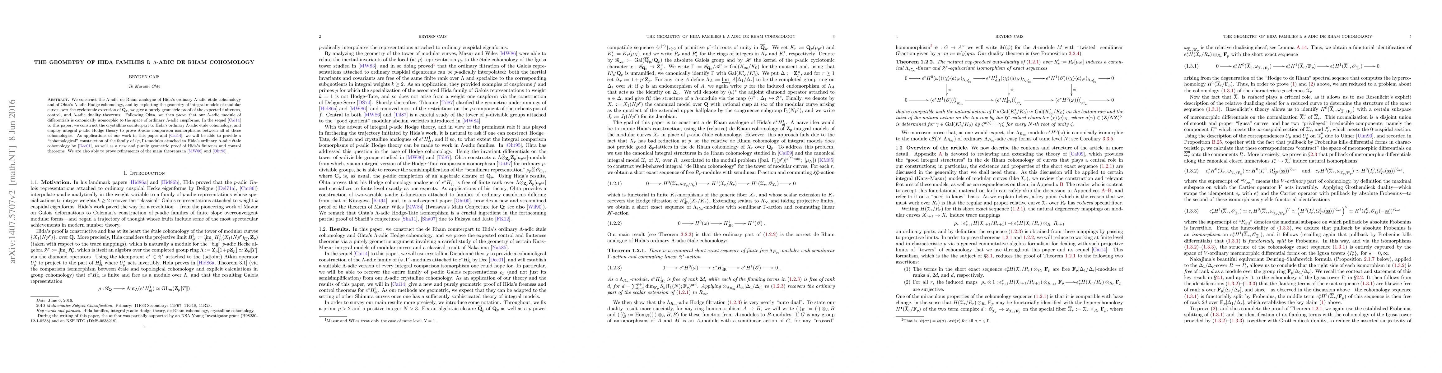 We construct the $\Lambda$-adic de Rham analogue of Hida's ordinary $\Lambda$-adic \'etale cohomology and of Ohta's $\Lambda$-adic Hodge cohomology, and by exploiting the geometry of integral models of modular curves over the cyclotomic extension of $\mathbf{Q}_p$, we give a purely geometric proof of the expected finiteness, control, and $\Lambda$-adic duality theorems. Following Ohta, we then prove that our $\Lambda$-adic module of differentials is canonically isomorphic to the space of ordinary $\Lambda$-adic cuspforms. In the sequel to this paper, we construct the crystalline counterpart to Hida's ordinary $\Lambda$-adic \'etale cohomology, and employ integral $p$-adic Hodge theory to prove $\Lambda$-adic comparison isomorphisms between all of these cohomologies. As applications of our work in this paper and the sequel, we will be able to provide a "cohomological" construction of the family of $(\varphi,\Gamma)$-modules attached to Hida's ordinary $\Lambda$-adic \'etale cohomology by the work of Dee, as well as a new and purely geometric proof of Hida's finitenes and control theorems. We are also able to prove refinements of theorems of Mazur-Wiles and of Ohta.