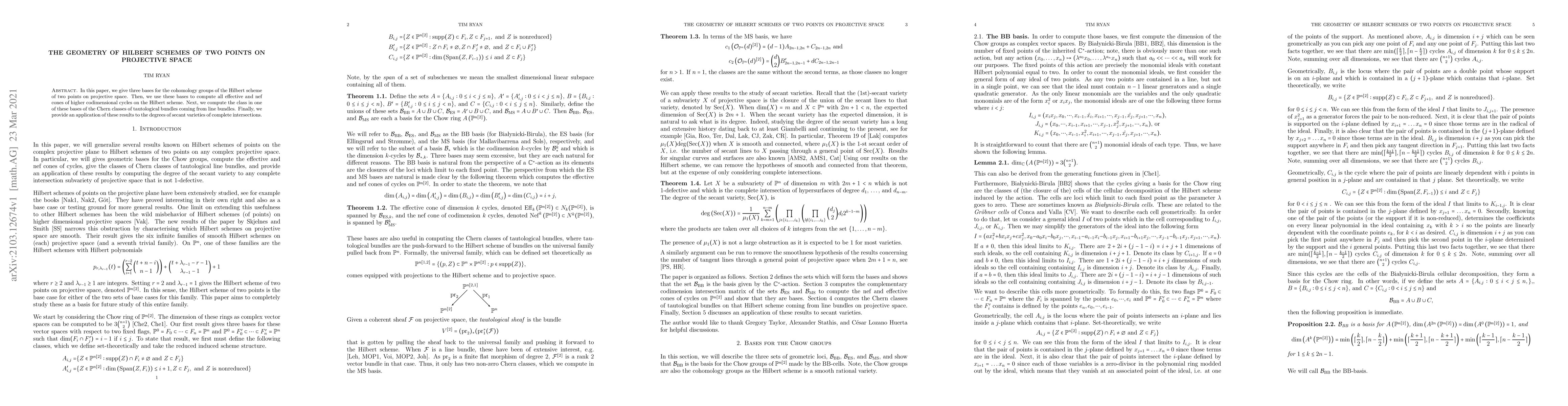 This paper presents three bases for the cohomology groups of the Hilbert scheme of two points on projective space and computes effective and nef cones for higher codimensional cycles. It also determines the class in one of these bases of the Chern classes of tautological bundles, with an application to the degrees of secant varieties of complete intersections.