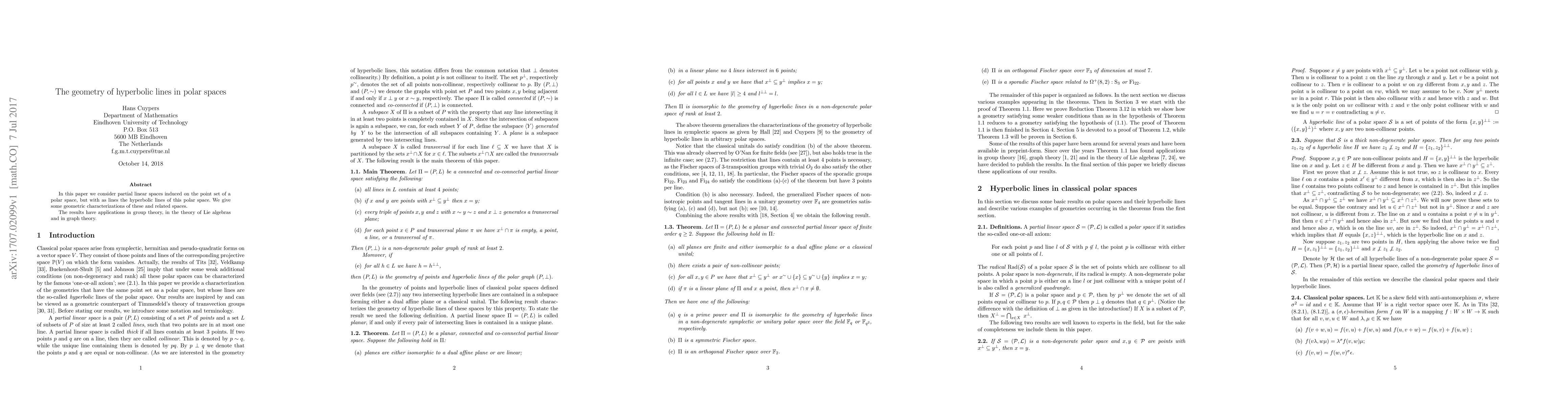 In this paper we consider partial linear spaces induced on the point set of a polar space, but with as lines the hyperbolic lines of this polar space. We give some geometric characterizations of these and related spaces. The results have applications in group theory, in the theory of Lie algebras and in graph theory.