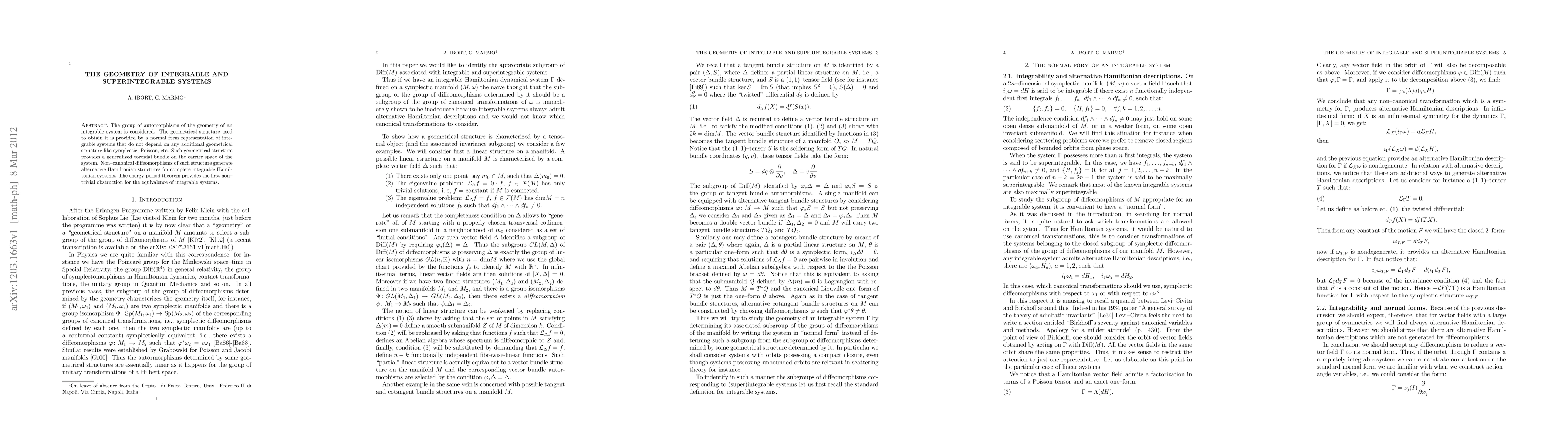 This paper explores the automorphisms of integrable systems' geometry through a normal form representation, revealing a generalized toroidal bundle structure. It discusses how non-canonical diffeomorphisms generate alternative Hamiltonian structures for superintegrable systems, with the energy-period theorem serving as a key obstruction to system equivalence.