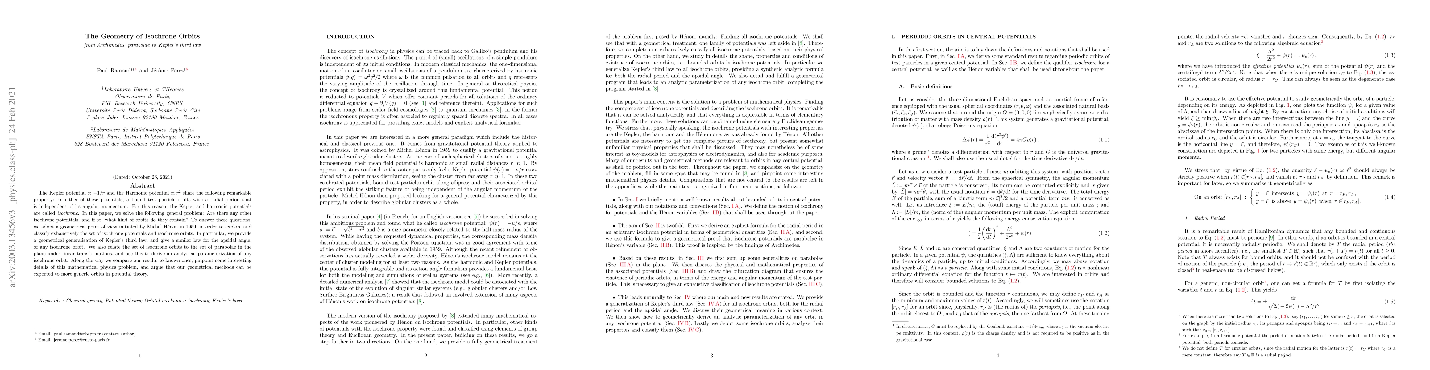In classical mechanics, the Kepler potential and the Harmonic potential share the following remarkable property: in either of these potentials, a bound test particle orbits with a radial period that is independent of its angular momentum. For this reason, the Kepler and Harmonic potentials are called \it{isochrone}. In this paper, we solve the following general problem: are there any other isochrone potentials, and if so, what kind of orbits do they contain? To answer these questions, we adopt a geometrical point of view initiated by Michel H\'enon in 1959, in order to explore and classify exhaustively the set of isochrone potentials and isochrone orbits. In particular, we provide a geometric generalization of Kepler's third law, and give a similar law for the apsidal angle, for any isochrone orbit. We also relate the set of isochrone orbits to the set of parabolae in the plane under linear transformations, and use this to derive an analytical parameterization of any isochrone orbit. Along the way we compare our results to known ones, pinpoint some interesting details of this mathematical physics problem, and argue that our geometrical methods can be exported to more generic orbits in potential theory.