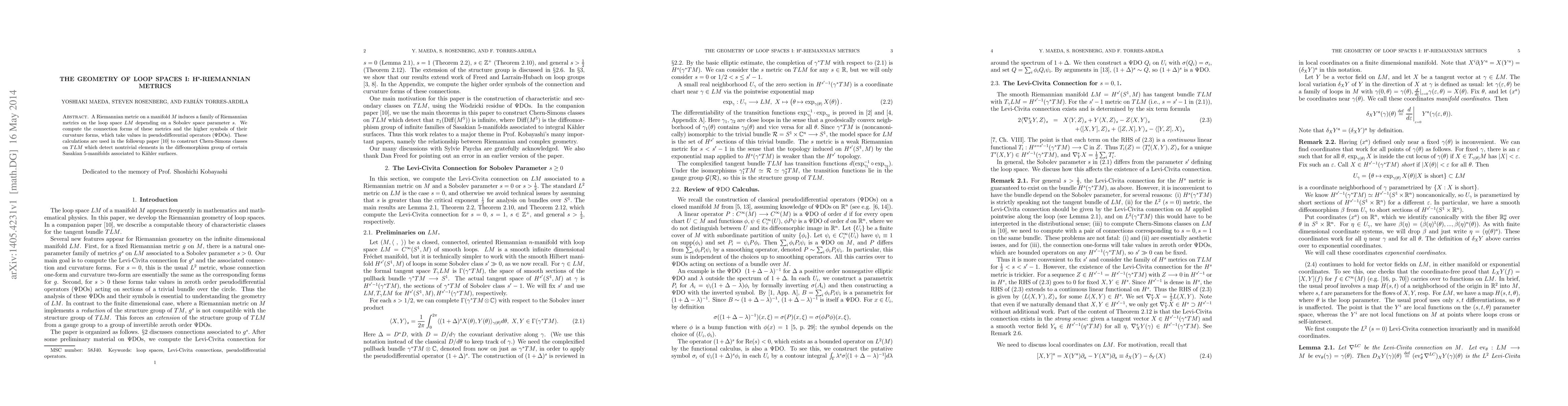 A Riemannian metric on a manifold M induces a family of Riemannian metrics on the loop space LM depending on a Sobolev space parameter s. We compute the connection forms of these metrics and the higher symbols of their curvature forms, which take values in pseudodifferential operators. These calculations are used in a followup paper "The Geometry of Loop Spaces II: Characteristic Classes" to construct Chern-Simons classes on the tangent bundle TLM which detect nontrivial elements in the diffeomorphism group of certain Sasakian 5-manifolds associated to Kaehler surfaces.