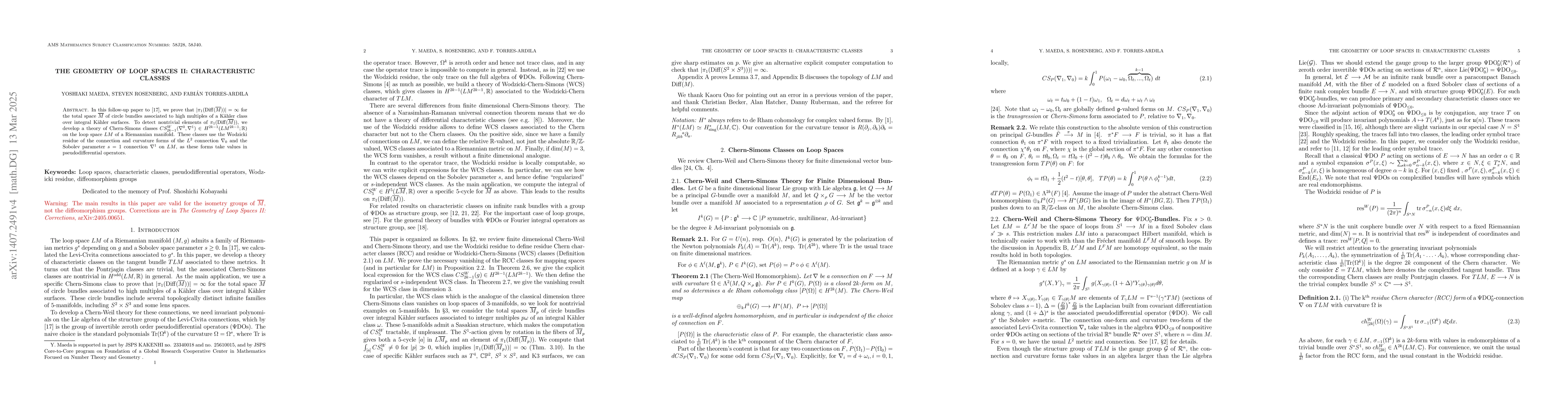 Using the Wodzicki residue, we build Wodzicki-Chern-Simons (WCS) classes in $H^{2k-1}(LM)$ associated to the residue Chern character on the loop space $LM$ of a Riemannian manifold $M^{2k-1}$. These WCS classes are associated to the $L^2$ connection and the Sobolev $s=1$ connections on $LM.$ The WCS classes detect several families of 5-manifolds whose diffeomorphism group has infinite fundamental group. These manifolds are the total spaces of the circle bundles associated to a multiple $p\omega, |p|\gg 0$, of the K\"ahler form $\omega$ over an integral K\"ahler surface.