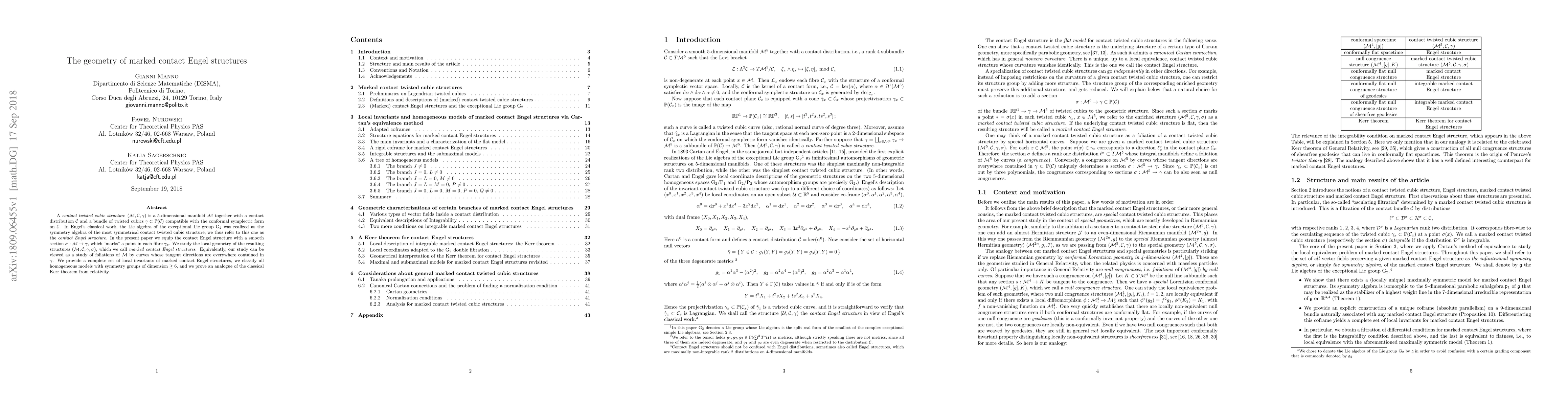 A contact twisted cubic structure (M,C,S) is a 5-dimensional manifold M together with a contact distribution C and a bundle S of twisted cubics that is compatible with the conformal symplectic form on C. In Engel's classical work, the Lie algebra of the exceptional Lie group G_2 was realized as the symmetry algebra of the most symmetric contact twisted cubic structure; we thus refer to this one as the contact Engel structure. In the present paper we equip the contact Engel structure with a smooth section s: M-> S that `marks' a point in each twisted cubic. We study the local geometry of the resulting structures (M,C,S,s), which we call marked contact Engel structures. Equivalently, our study can be viewed as a study of foliations of M by curves whose tangent directions are everywhere contained in S. We provide a complete set of local invariants of marked contact Engel structures, we classify all homogeneous models with symmetry groups of dimension greater than 5, and we prove an analogue of the classical Kerr theorem from relativity.