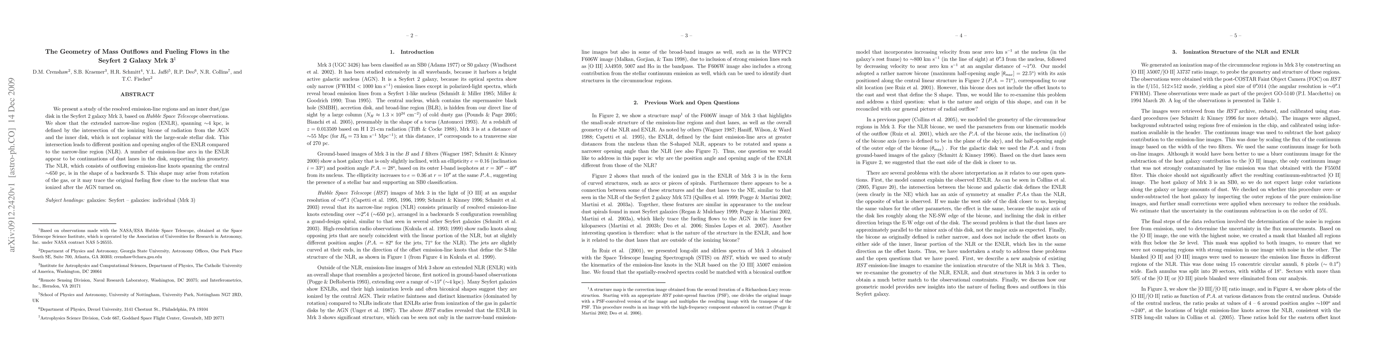 Researchers studied the Seyfert 2 galaxy Mrk 3 using Hubble Space Telescope observations to understand its mass outflows and fueling flows. They found that the extended narrow-line region is shaped by an intersection of ionizing radiation and a non-coplanar inner disk.