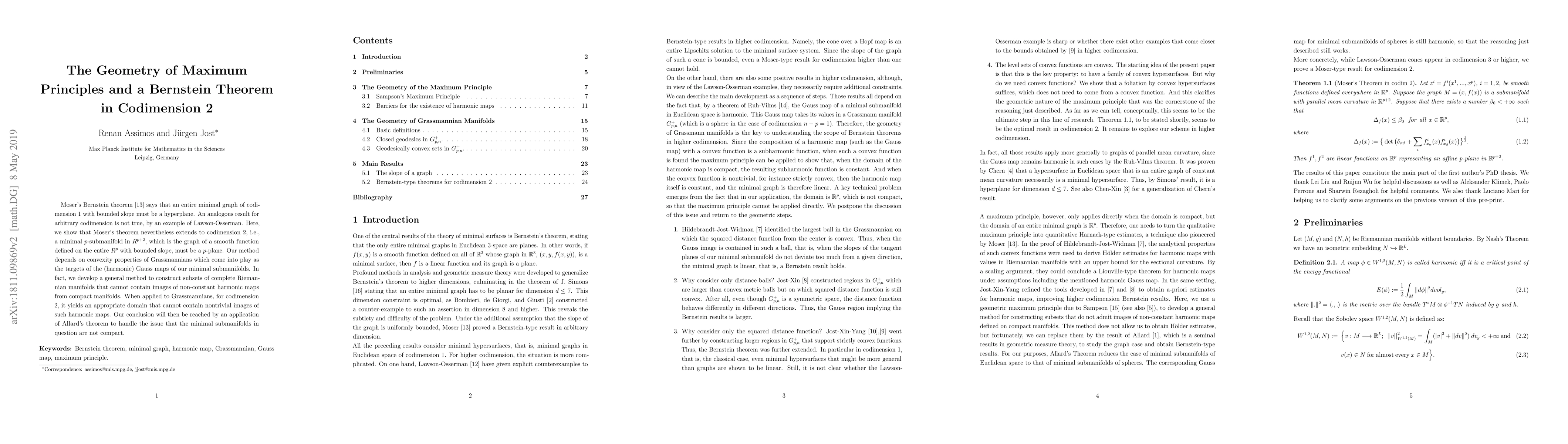 Moser's Bernstein theorem \cite{moser61} says that an entire minimal graph of codimension 1 with bounded slope must be a hyperplane. An analogous result for arbitrary codimension is not true, by an example of Lawson-Osserman. Here, we show that Moser's theorem nevertheless extends to codimension 2, i.e., a minimal $p$-submanifold in $R^{p+2}$, which is the graph of a smooth function defined on the entire $R^p$ with bounded slope, must be a $p$-plane. Our method depends on convexity properties of Grassmannians which come into play as the targets of the (harmonic) Gauss maps of our minimal submanifolds. In fact, we develop a general method to construct subsets of complete Riemannian manifolds that cannot contain images of non-constant harmonic maps from compact manifolds. When applied to Grassmannians, for codimension 2, it yields an appropriate domain that cannot contain nontrivial images of such harmonic maps. Our conclusion will then be reached by an application of Allard's theorem to handle the issue that the minimal submanifolds in question are not compact.