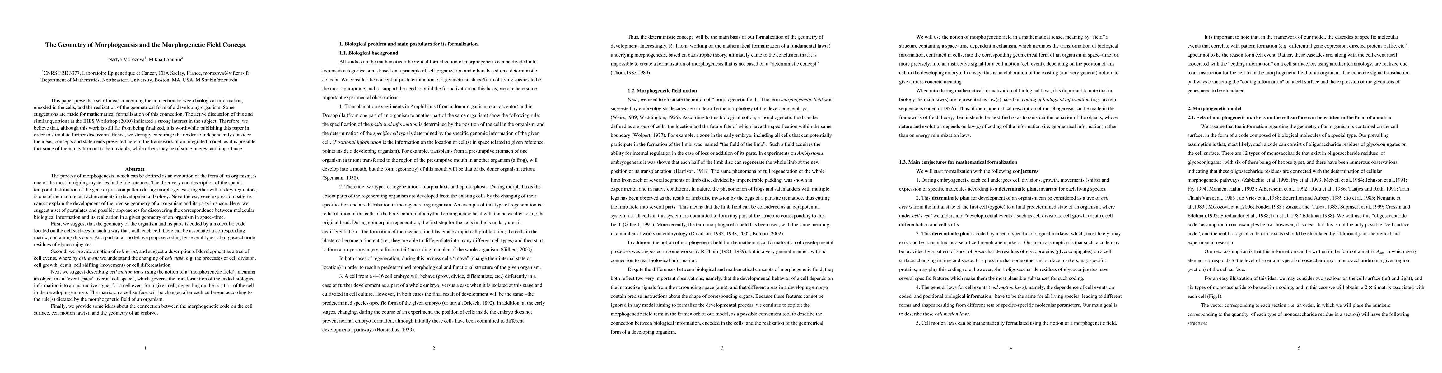 The process of morphogenesis, which can be defined as an evolution of the form of an organism, is one of the most intriguing mysteries in the life sciences. It is clear, that gene expression patterns cannot explain the development of the precise geometry of an organism and its parts in space. Here, we suggest a set of postulates and possible approaches for discovering the correspondence between molecular biological information and its realization in a given geometry of an organism in space-time. First, we suggest that the geometry of the organism and its parts is coded by a molecular code located on the cell surfaces in such a way that, with each cell, there can be associated a corresponding matrix, containing this code. As a particular model, we propose coding by several types of oligosaccharide residues of glycoconjugates. Second, we provide a notion of cell event, and suggest a description of development as a tree of cell events, where under cell event we understand the changing of cell state, e.g. the processes of cell division, cell growth/death, shift or differentiation. Next we suggest describing these cell motion laws using the notion of a "morphogenetic field", meaning by the field an object in an "event space" over a "cell space", which govern the transformation of the coded biological information into an instructive signal for a cell event for a given cell, depending on the position of a cell in the developing embryo. The matrix on a cell surface will be changed after each cell event according to the rule(s) dictated by the morphogenetic field of an organism. Finally, we provide some ideas on the connection between morphogenetic code on a cell surface, cell motion law(s) and the geometry of an embryo.